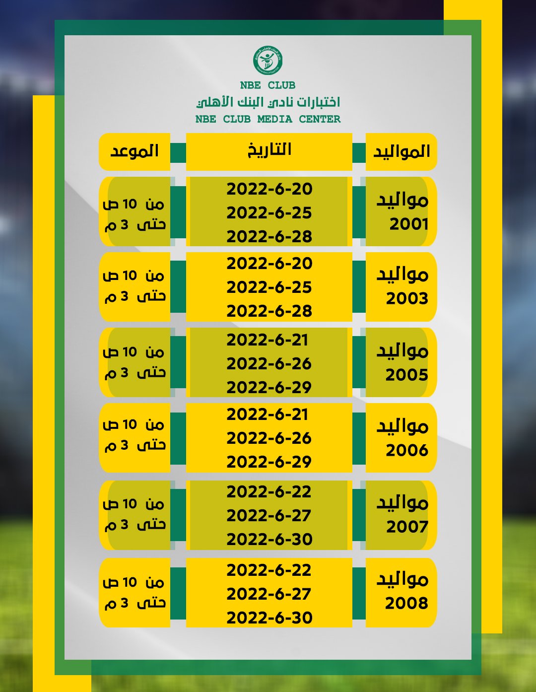 ومن المقرر أن تقام اختبارات الناشئين موسم 2022-2023، لمواليد 2001 و2002 و2003 و2004 و2005 و2006 و2007 و2008.