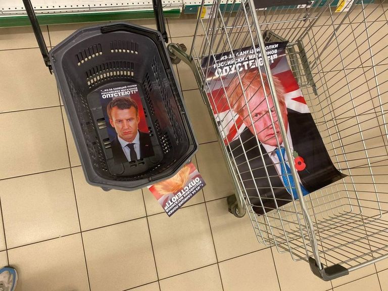 تداول رواد مواقع التواصل الاجتماعي، صورا من أحد المتجار في روسيا، توضع داخل عربة تسوق لزعماء الغرب، بايدن وماكرون وبوريس جونسون، مكتوبا عليها "بسبب عقوباتنا ستكون المتاجر الروسية فارغة".