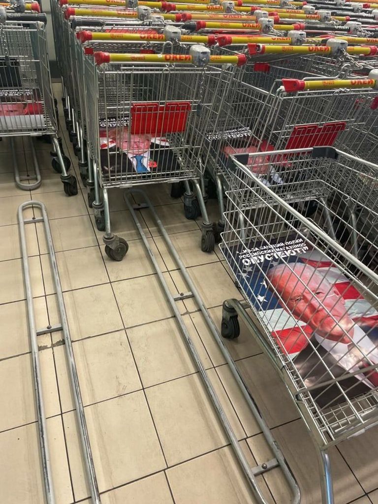 وبطريقة ساخرة تم وضع صور الزعماء الثلاثة في عربات التسوق داخل أحد المتاجر في روسيا، وذلك للسخرية من تأثير العقوبات التي فرضها الغرب ضد موسكو.