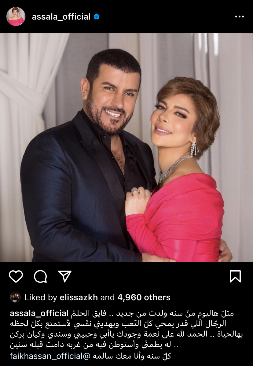 ونشرت أصالة صوره تجمعها بزوجها معلقة عليها قائلة: " متلّ هاليوم منّ سنه ولدت من جديد.. فايق الحلمّ الرجّال الّلي قدر يمحي كلّ التّعب ويهديني نفّسي لأستمتع بكلّ لحظه بهالحياة.. الحمد لله على نعمة وجودك ياأبي وحبيبي وسندي وكيان بركن له يطمنّي وأستوطن فيه من غربه دامت قبله سنين.. كلّ سنه وأنا معك سالمه".