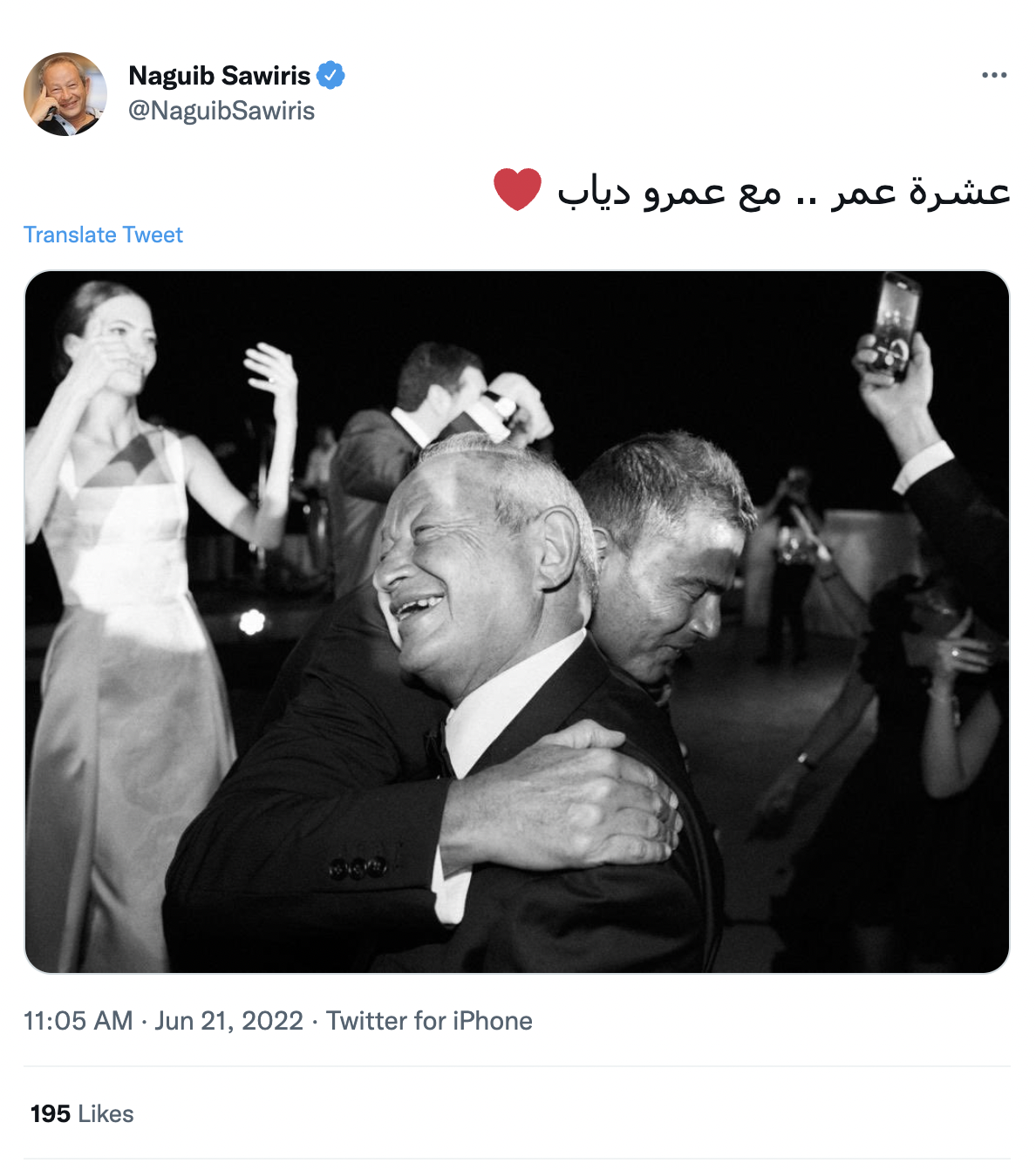 نشر المهندس ورجل الأعمال نجيب ساويرس صورة له عبر حسابه الرسمي على موقع التغريدات القصيرة “تويتر” يظهر فيها بصحبة المغني عمرو دياب وهو يحتضنه، معلقا: “عشرة عمر”.