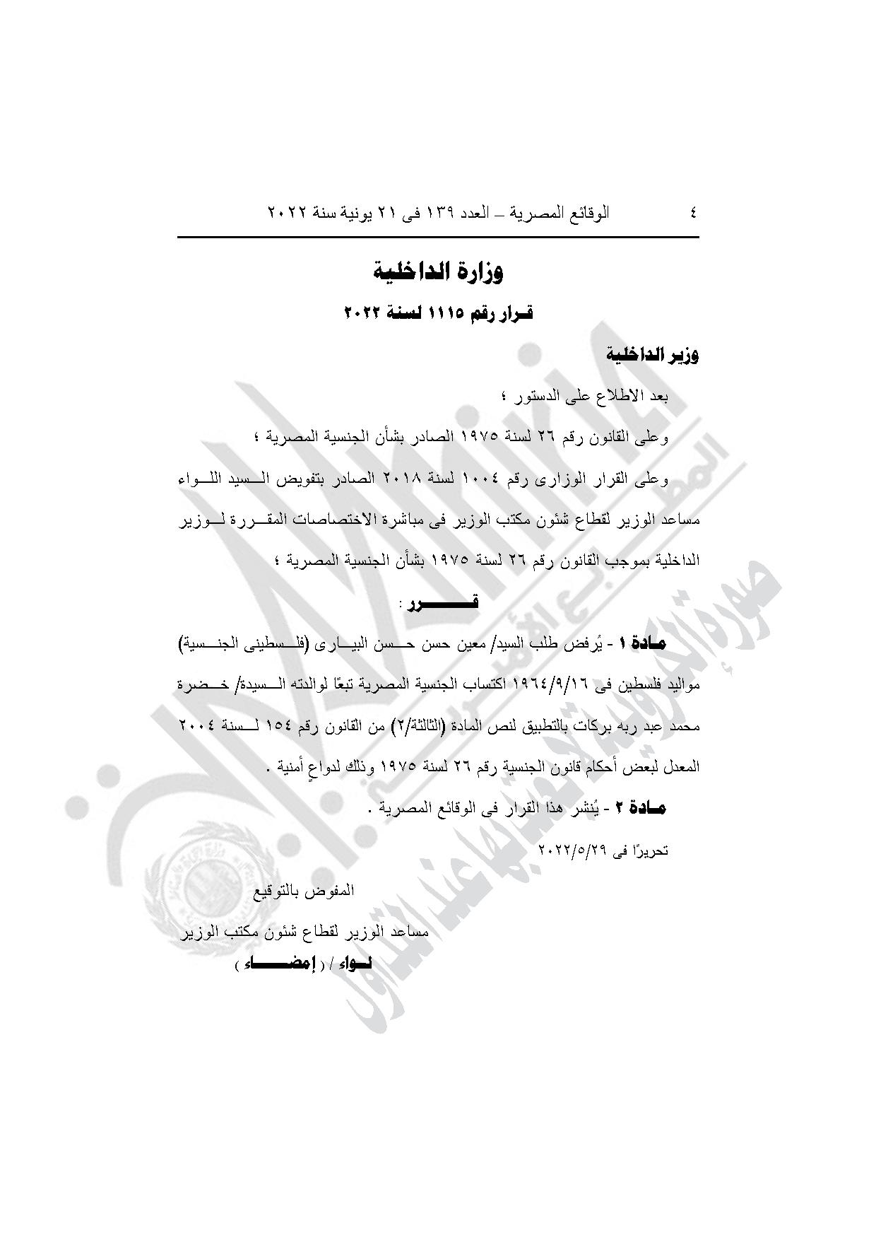 وقرار وزارة الداخلية رقم 1115 لسنة 2022، برفض طلب معين حسن حسن البياري (فلسطيني الجنسية)، مواليد فلسطين في 16/9/1964، اكتساب الجنسية المصرية تبعًا لوالدته خضرة محمد عبد ربه بركات بالتطبيق لنص المادة (الثالثة/2) من القانون رقم 154 لسنة 2004 المُعدل لبعض أحكام قانون الجنسية رقم 26 لسنة 1975 وذلك لدواعٍ أمنية.