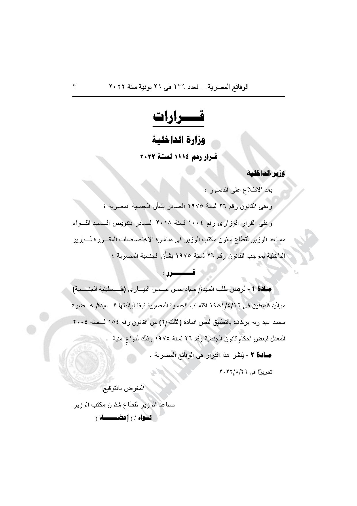 القرار رقم 1114 لسنة 2022، برفض طلب سهاد حسن حسن البياري (فلسطينية الجنسية)، مواليد فلسطين في 12/4/1981، اكتساب الجنسية المصرية تبعًا لوالدتها خضرة محمد عبد ربه بركات بالتطبيق لنص المادة (الثالثة/2) من القانون رقم 154 لسنة 2004 المُعدل لبعض أحكام قانون الجنسية رقم 26 لسنة 1975 وذلك لدواعٍ أمنية.