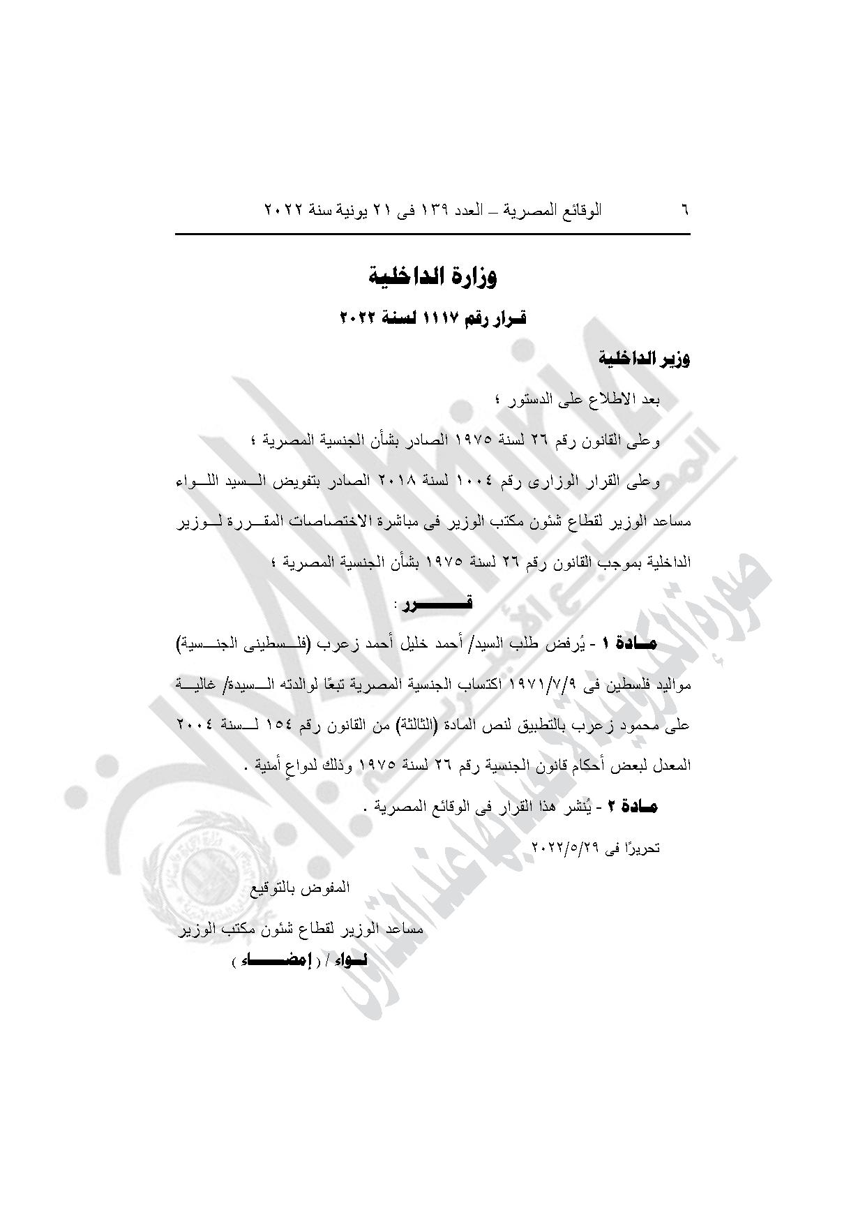 وقرار وزارة الداخلية رقم 1117 لسنة 2022، برفض طلب أحمد خليل أحمد زعرب (فلسطيني الجنسية)، مواليد فلسطين في 16/9/1964، اكتساب الجنسية المصرية تبعًا لوالدته غالية علي محمود زعرب بالتطبيق لنص المادة (الثالثة/2) من القانون رقم 154 لسنة 2004 المُعدل لبعض أحكام قانون الجنسية رقم 26 لسنة 1975 وذلك لدواعٍ أمنية.
