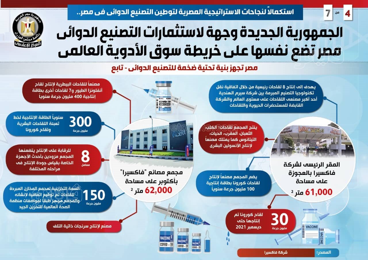 ولفت التقرير إلى أنه يجري إنشاء مجمع مصانع "فاكسيرا" بأكتوبر على مساحة 62.000 متر2، ويضم مصنعًا للقاحات البيطرية لإنتاج لقاح إنفلونزا الطيور و7 لقاحات أخرى بطاقة إنتاجية 400 مليون جرعة سنويًا، في حين تصل الطاقة الإنتاجية لخط تعبئة اللقاحات البشرية ولقاح كورونا إلى 300 مليون جرعة سنويًا.