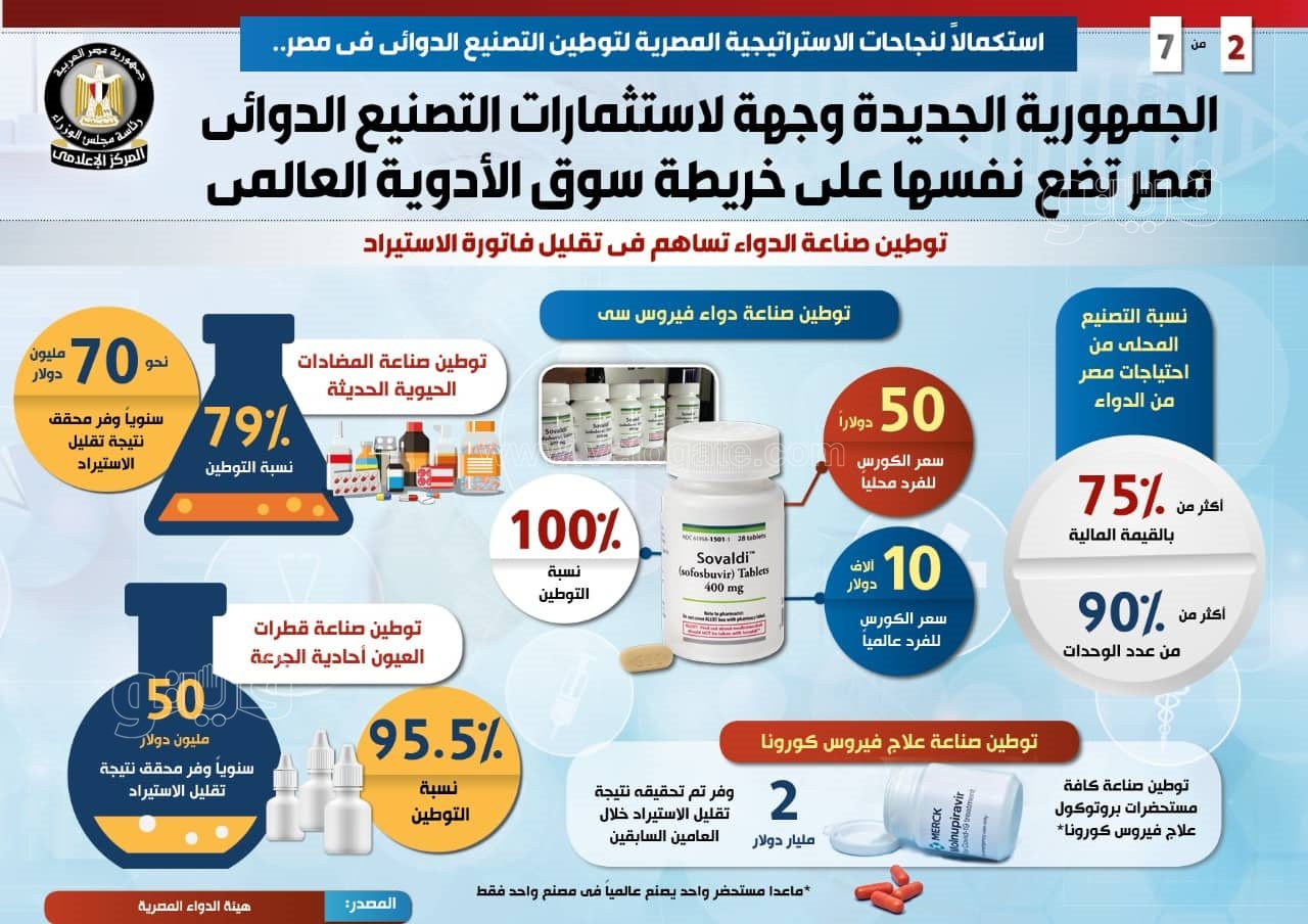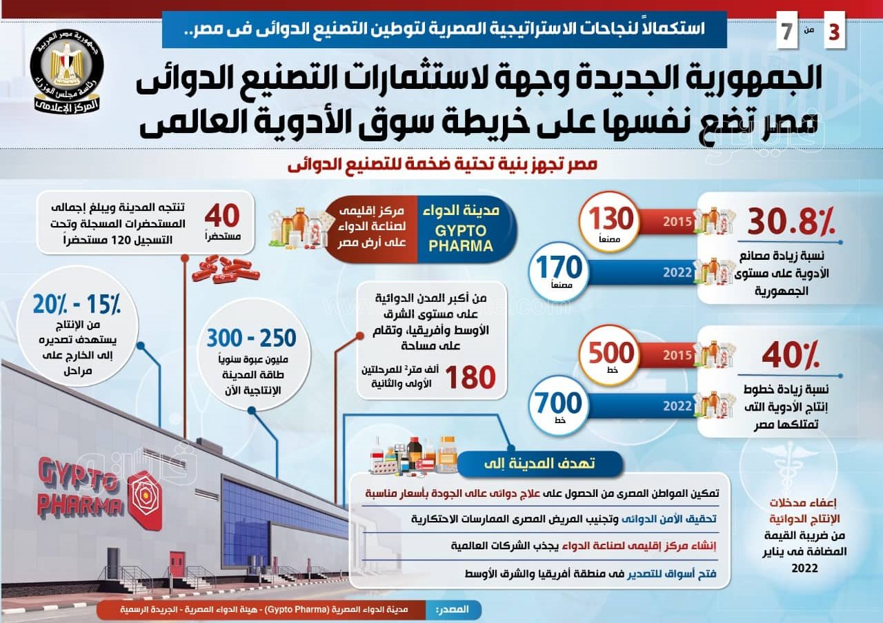 وفي هذا الصدد نشر المركز الإعلامي لمجلس الوزراء تقريرًا تضمن إنفوجرافات تسلط الضوء على وضع مصر على خريطة سوق الأدوية العالمي، بعد أن أصبحت الجمهورية الجديدة وجهة لاستثمارات التصنيع الدوائي، وذلك استكمالًا لنجاحات استراتيجيتها لتوطين تلك الصناعة.