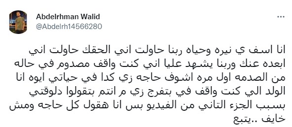 وكتب عبد الرحمن وليد تغريدة على تويتر "انا اسف ي نيره وحياه ربنا حاولت اني الحقك حاولت اني ابعده عنك وربنا يشهد عليا اني كنت واقف مصدوم في حاله من الصدمه اول مره اشوف حاجه زي كدا في حياتي ايوه انا الولد الي كنت واقف في بتفرج زي م انتم بتقولوا دلوقتي بسبب الجزء التاني من الفيديو بس انا هقول كل حاجه ومش خايف.. يتبع"