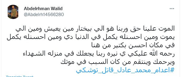 وقال عبد الرحمن وليد " الموت علينا حق وربنا هو الي بيختار مين يعيش ومين الي يموت ومين احسنله يكمل في الدنيا دي ومين احسنله يكمل في مكان احسن بكتير من هنا رحمه الله عليكي ي نيره ربنا يجعلك في منزله الشهداء ويرحمك وينتقم من كان السبب في موتك #اعدام_محمد_عادل_قاتل_توشكي"