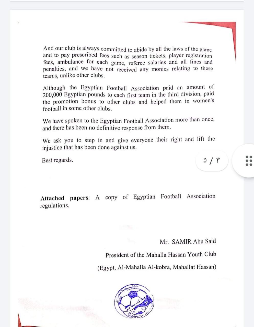 وأشار "مركز شباب محلة حسن " في خطاب الى ان المركز لم يتسلم هذه المكافأة حتى الآن رغم أن الاتحاد المصري لكرة القدم قام بمنحها لأندية اخرى.