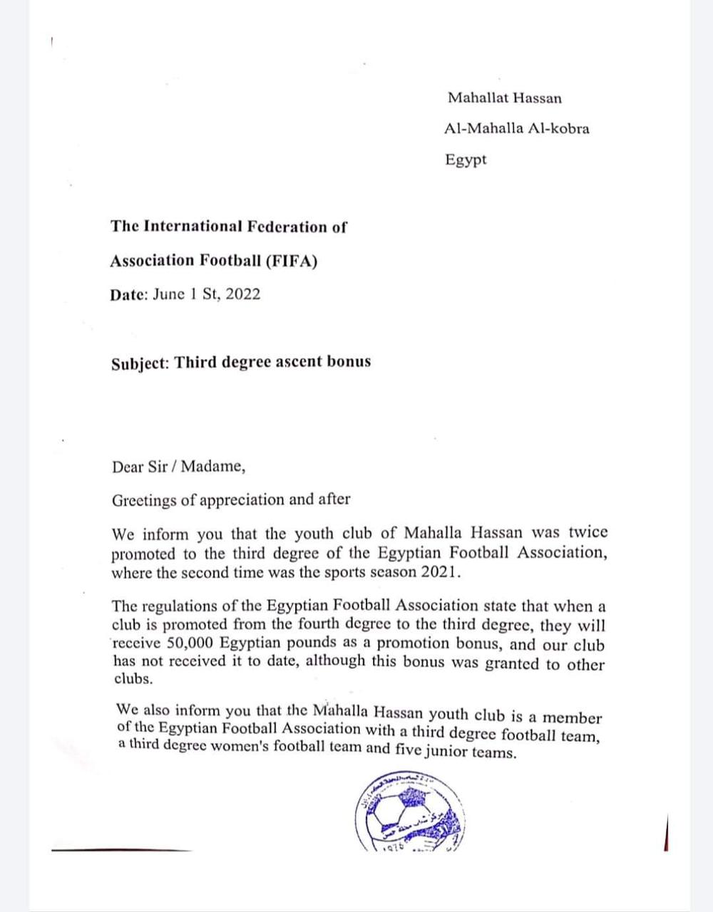 تقدم مركز شباب محلة حسن برئاسة سمير أبو سعيد رئيس المركز بشكوى إلى الاتحاد الدولي لكرة القدم "فيفا" ضد الاتحاد المصري لكرة القدم بسبب عدم صرف مكافأة الصعود من القسم الرابع إلى القسم الثالث.