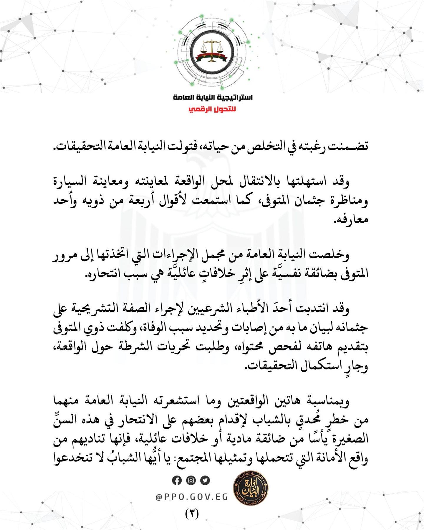 وخلصت النيابة من مجمل الإجراءات التى اتخذتها إلى مرور المتوفى بضائقة مالية بسبب أعبائه الشخصية التى تسببت فى ضغوط نفسية أصابته.