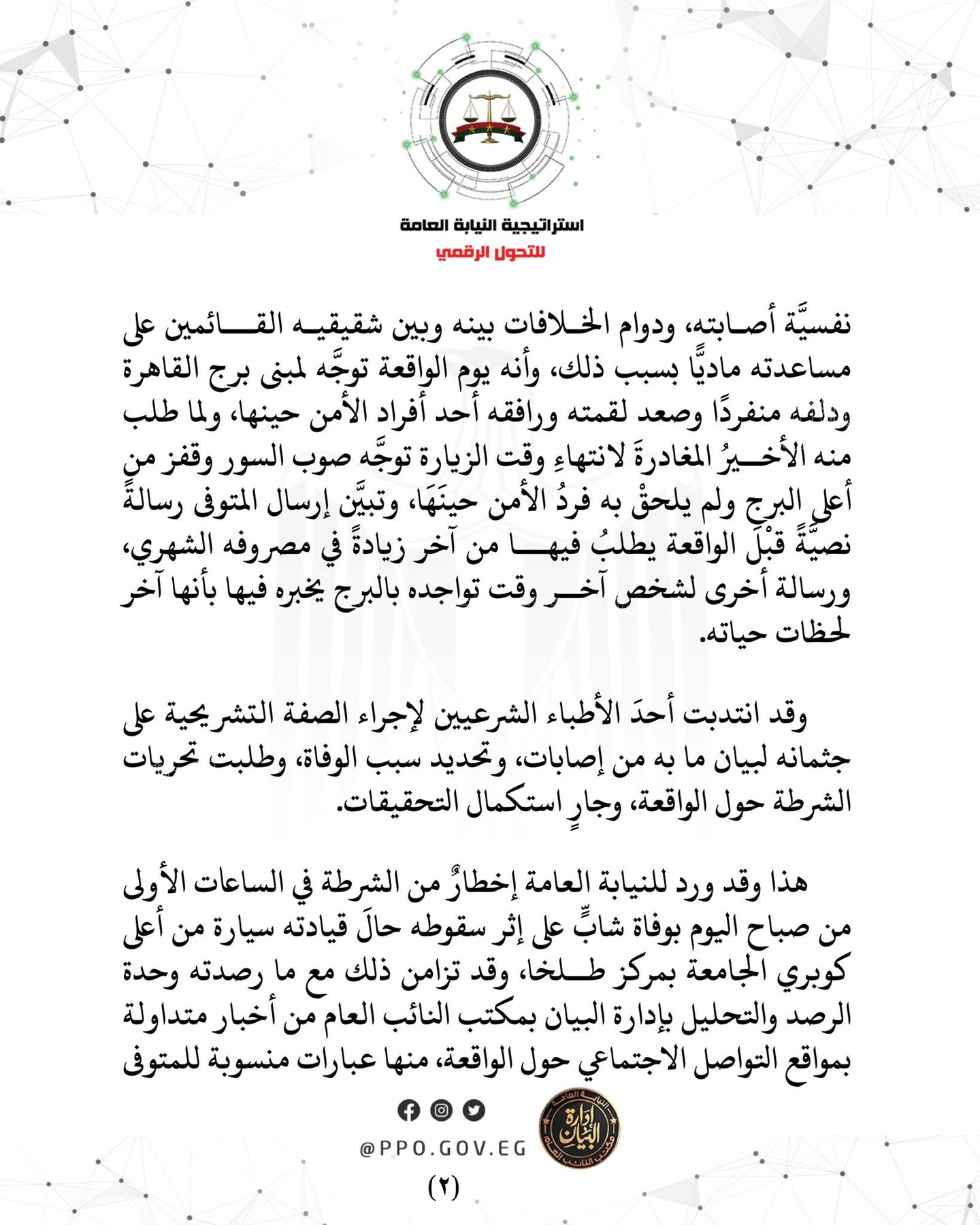 كانت النيابة العامة تلقت إخطارا بسقوط شاب من أعلى برج القاهرة بالتزامن مع ما رصدته وحدة والتحليل بإدارة البيان بمكتب النائب العام.