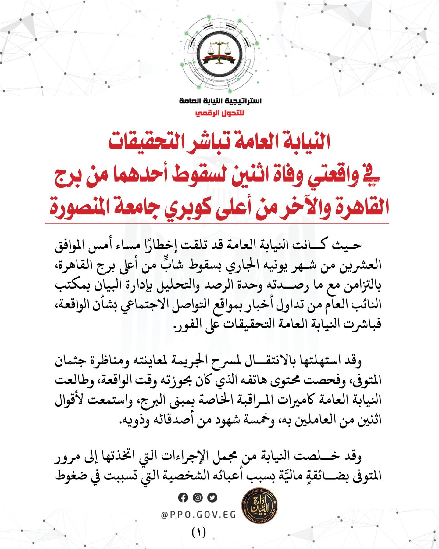 النائب العام يكشف تفاصيل وفاة شابين لسقوطهما من برج القاهرة وكوبري جامعة المنصورة
