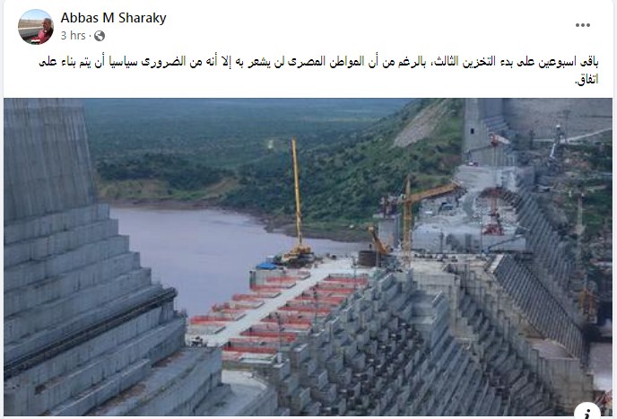 وكتب عباس شراقي تدوينة على الفيس بوك "اثيوبيا تسابق الزمن فى تعلية سد النهضة: اثيوبيا تسابق الزمن فى تعلية سد النهضة بوضع الخرسانة على جانبى سد النهضة والممر الأوسط قبل هطول الأمطار الشديدة بعد أقل من اسبوعين"