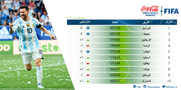 تصنيف الفيفا.. البرازيل تحافظ على الصدارة والأرجنتين تقتحم المقدمة