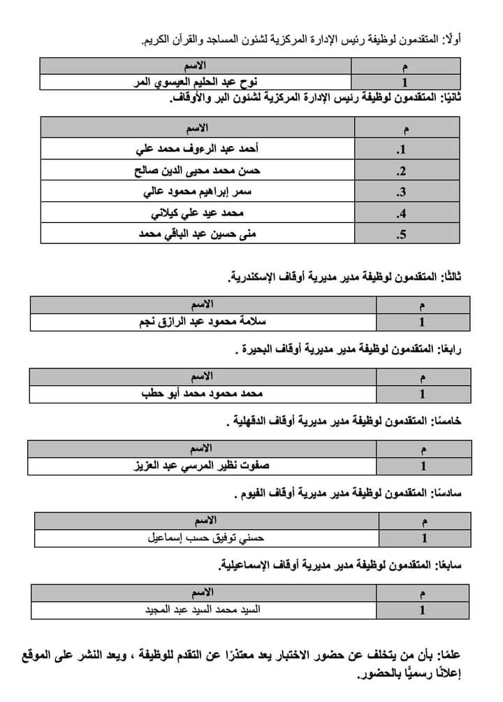 أعلنت وزارة الأوقاف عن موعد دخول الاختبار التحريري في مجال التخصص للمتقدمين لشغل وظيفة: (رئيس الإدارة المركزية لشئون المساجد والقرآن الكريم - رئيس الإدارة المركزية لشئون البر والأوقاف - مدير مديرية أوقاف الإسكندرية - مدير مديرية أوقاف البحيرة - مدير مديرية أوقاف الدقهلية - مدير مديرية أوقاف الفيوم - مدير مديرية أوقاف الإسماعيلية)، وذلك يوم: الخميس 30 / 6 / 2022م بديوان عام الوزارة.