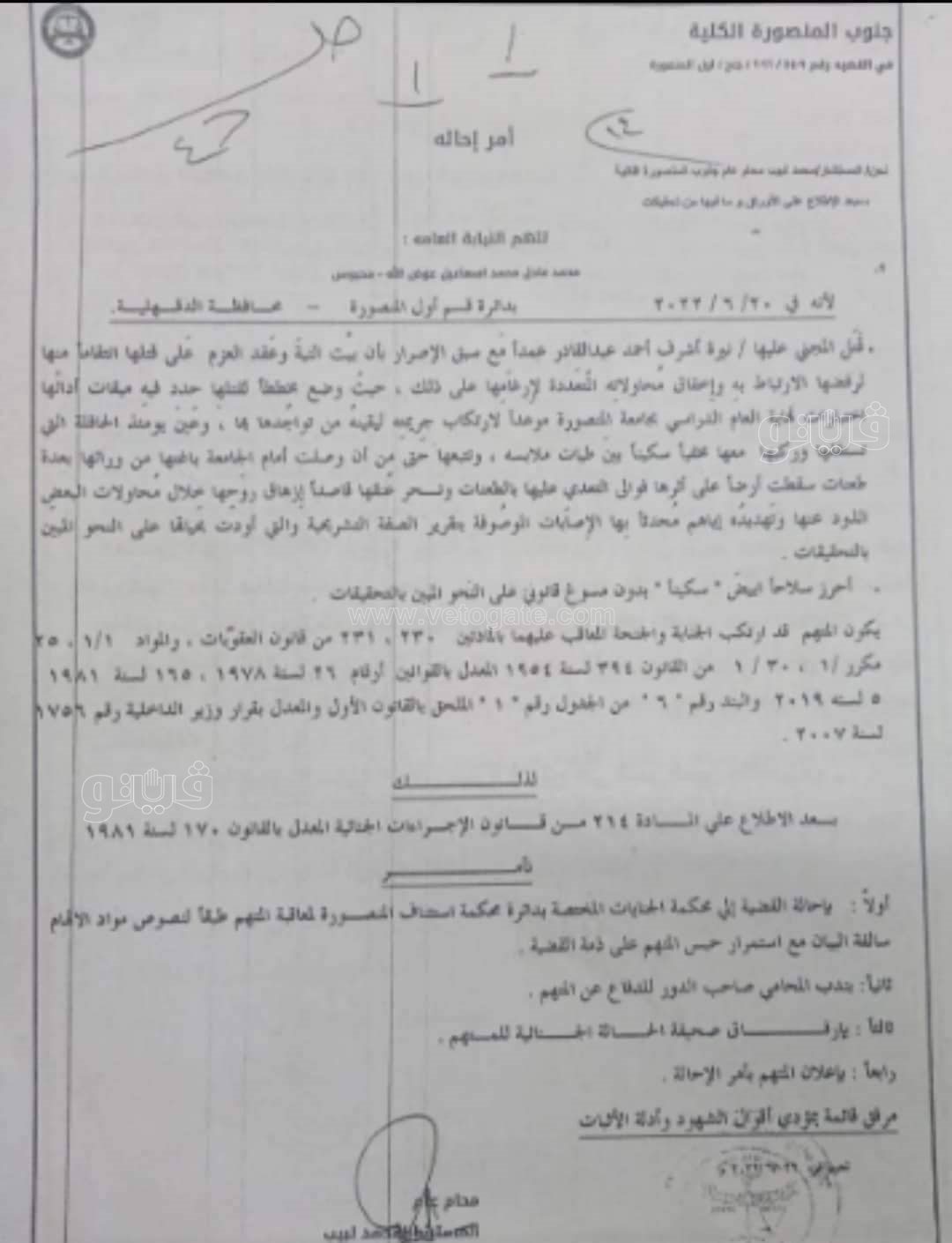 ننشر أمر إحالة المتهم بقتل طالبة المنصورة نيرة أشرف| مستند