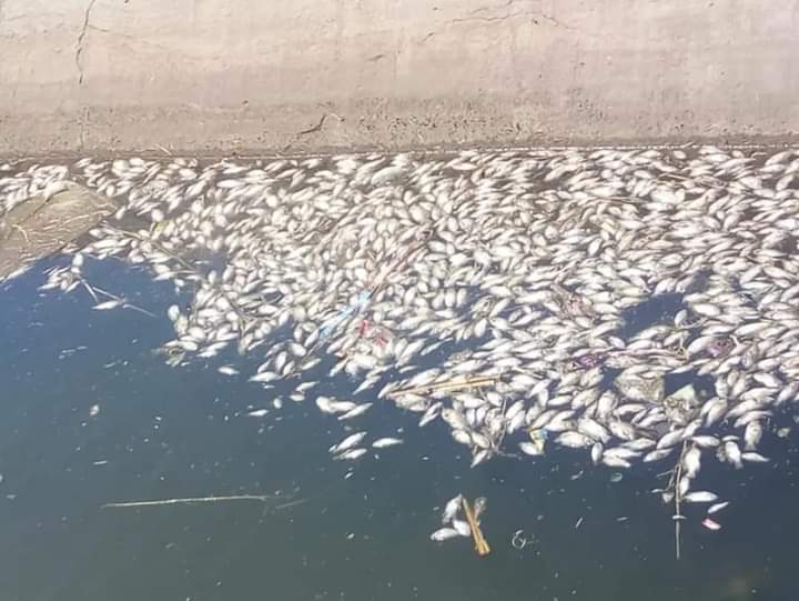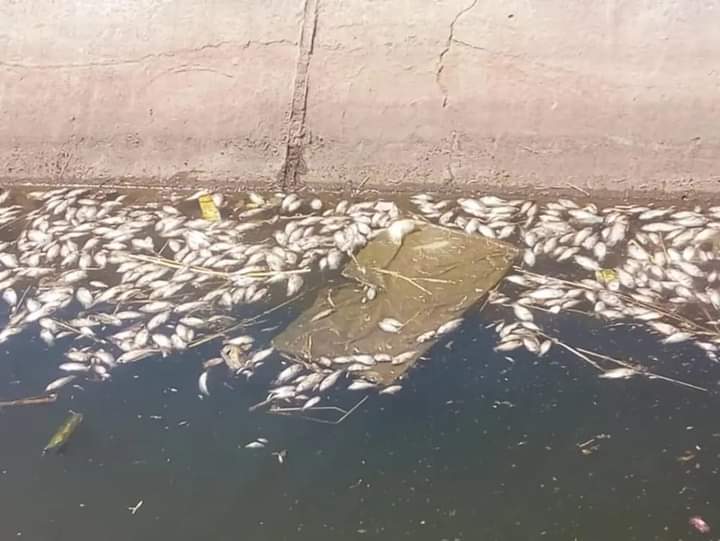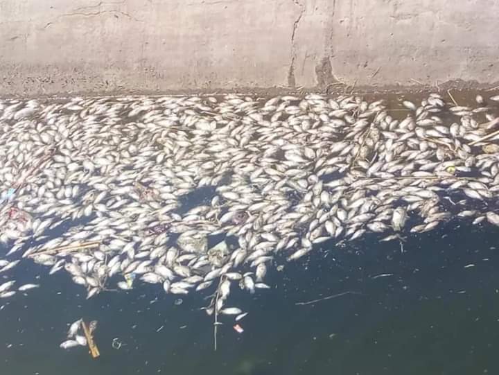 حيث تم معاينة الترعة المبطنة التي عثر بها على كميات كبيرة من الأسماك النافقة.