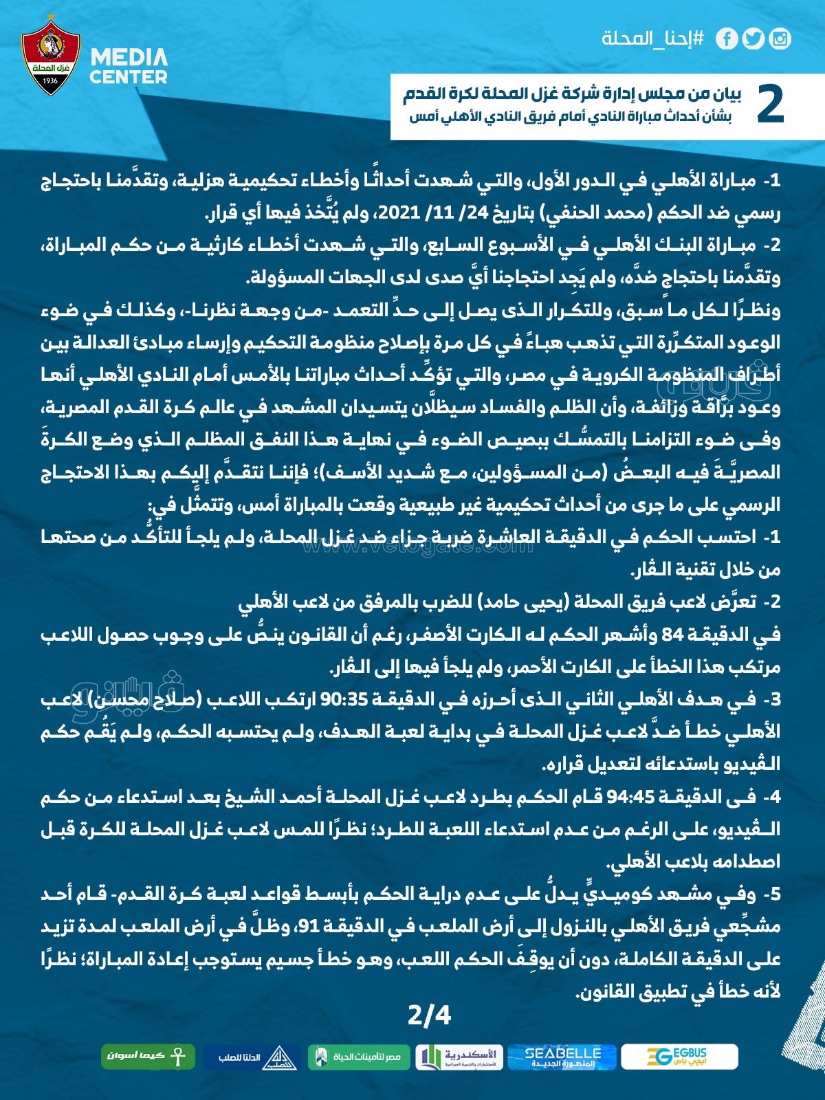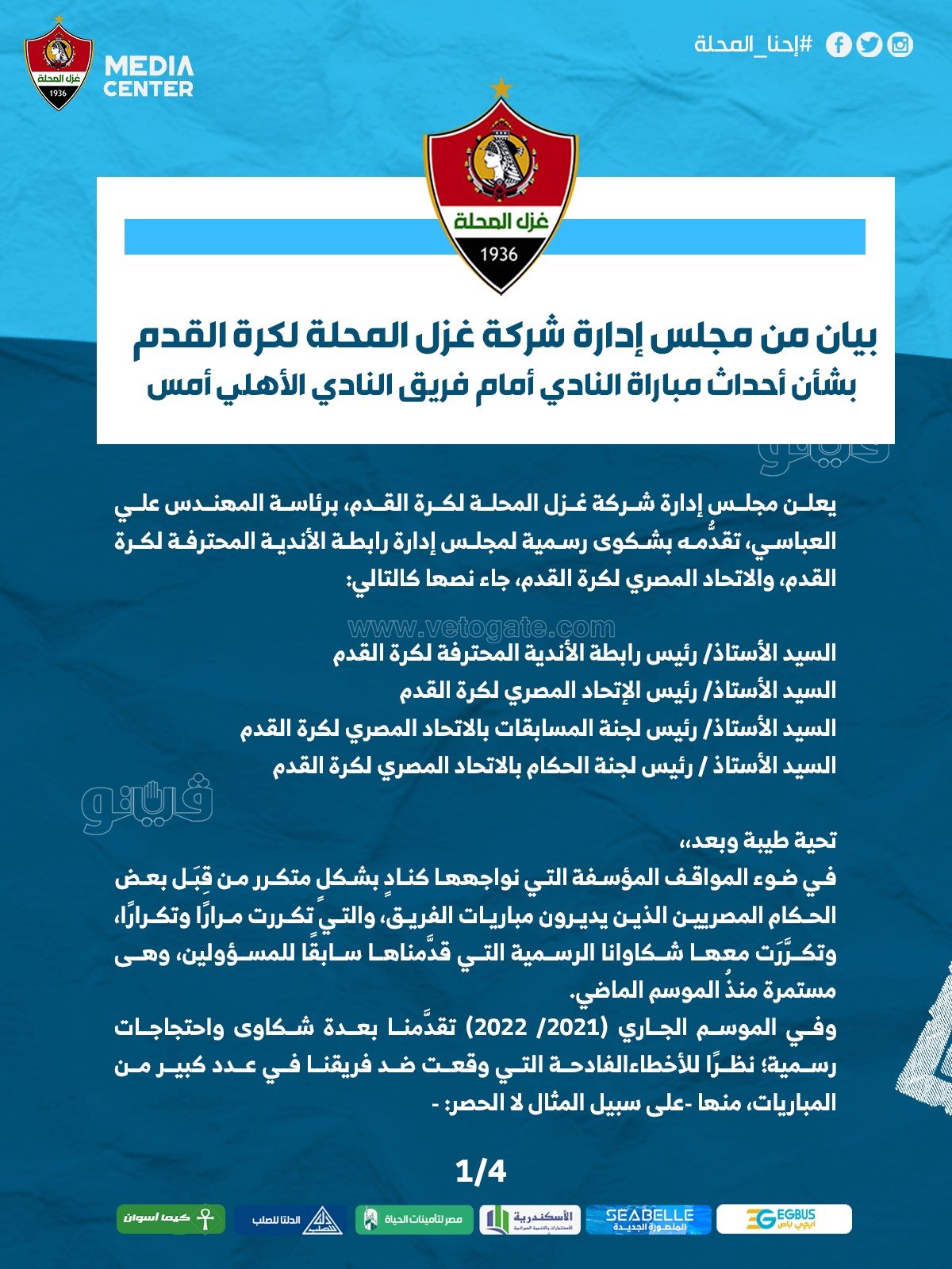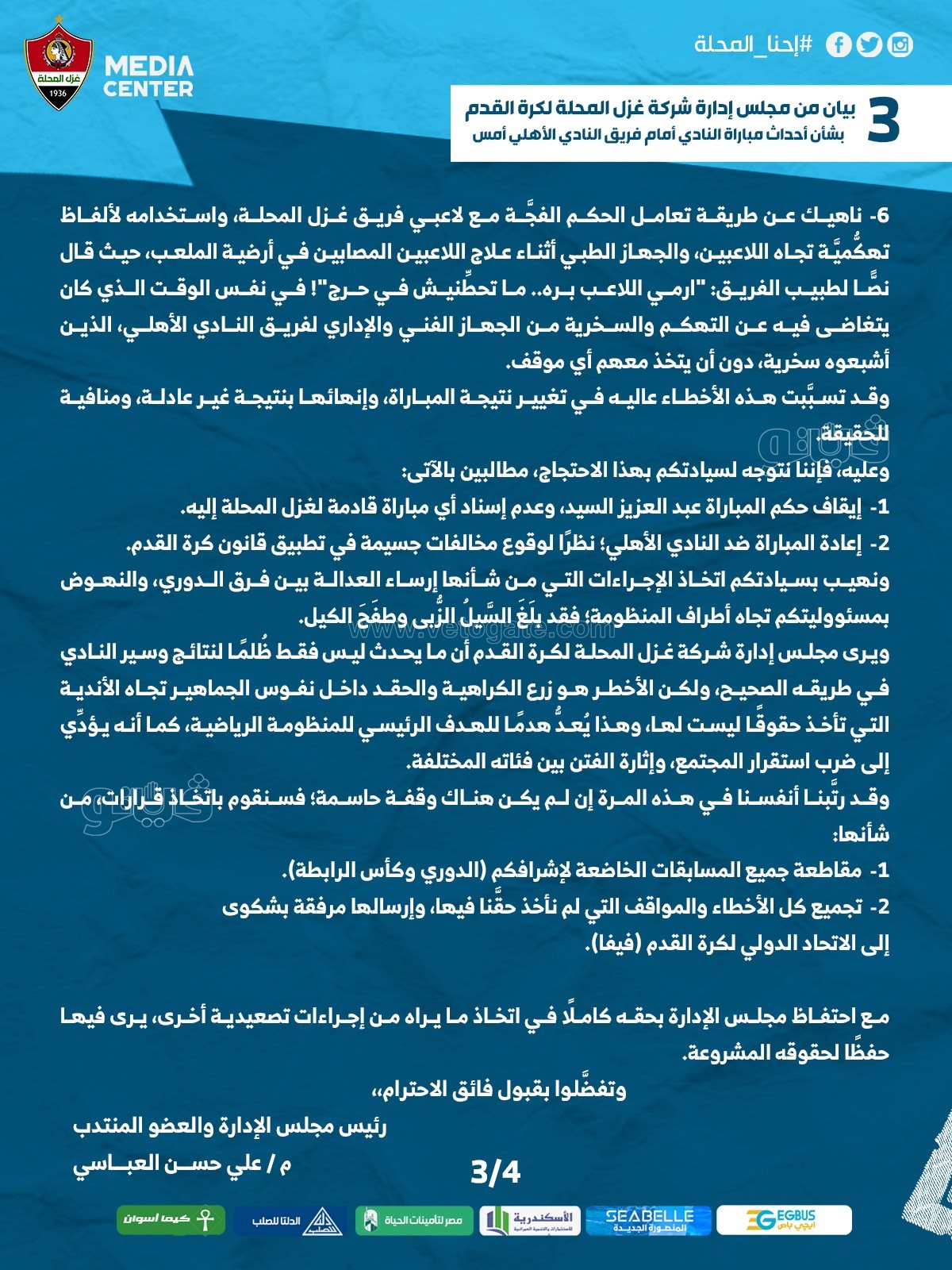 وأكد بيان نادي غزل المحلة:" يعلن مجلس إدارة شركة غزل المحلة لكرة القدم، برئاسة المهندس علي العباسي، تقدُّمه بشكوى رسمية لمجلس إدارة رابطة الأندية المحترفة لكرة القدم، والاتحاد المصري لكرة القدم، جاء نصها كالتالي: