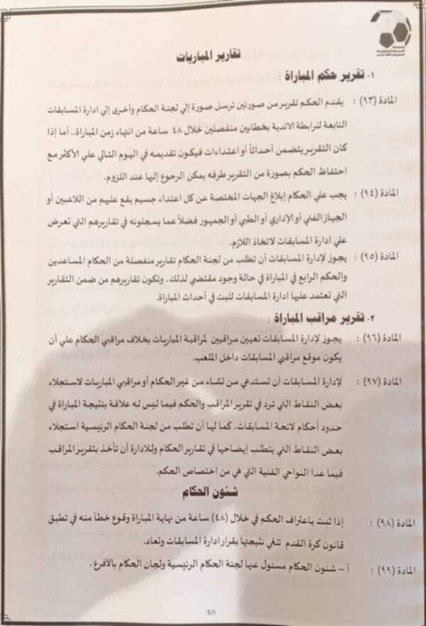 وجاءت نصوص لائحة رابطة الأندية في البنود المتعلقة بإعادة المباريات وكذلك عقوبة نزول المشجعين إلى أرض الملعب.