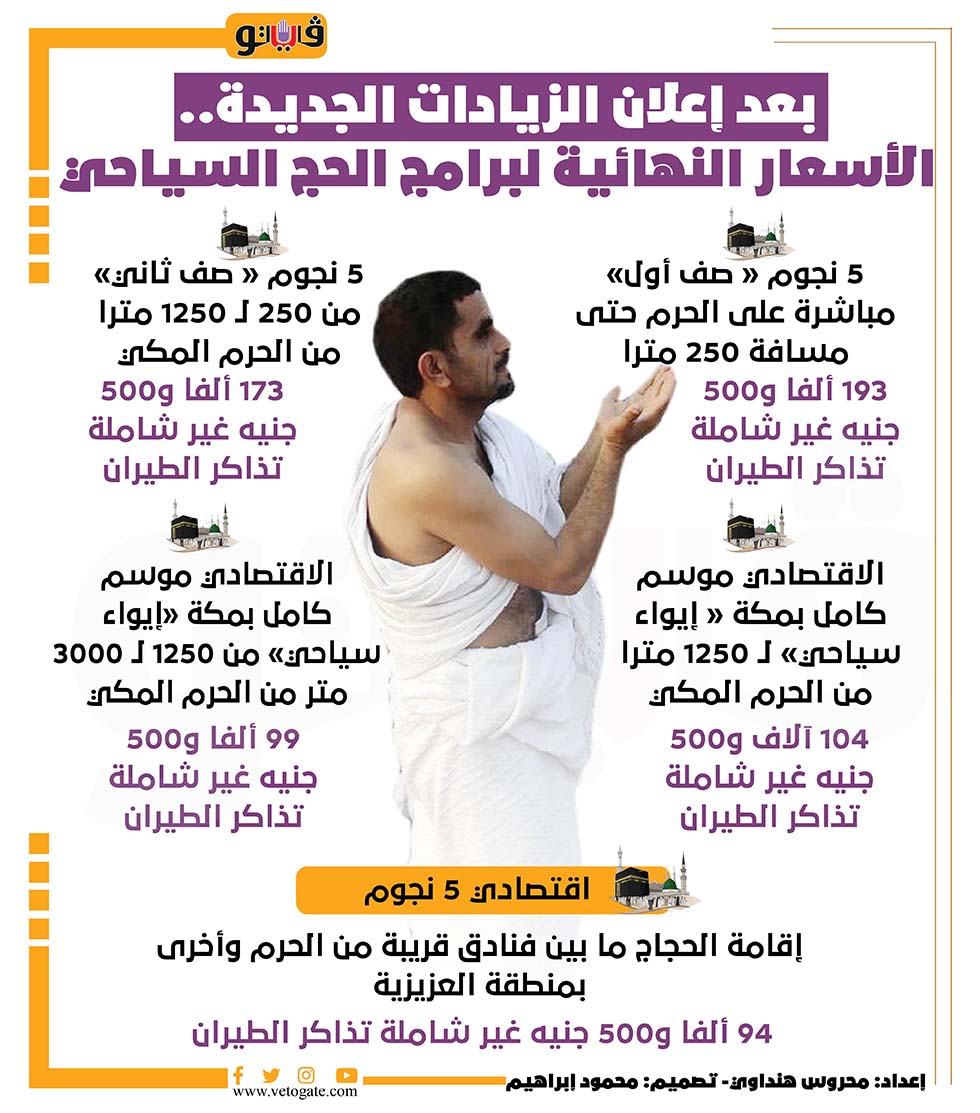بعد إعلان الزيادات الجديدة.. الأسعار النهائية لبرامج الحج السياحي | إنفوجراف السبت 25/يونيو/2022 - 01:00 م 6/25/2022 1:00:20 PM رحلات الحج محروس هنداوي شارك طباعة 18 حجم الخط شارك طباعة الحرم المكي الحج الحج السياحى أسعار تذاكر الطيران برامج الحج اسعار برامج الحج