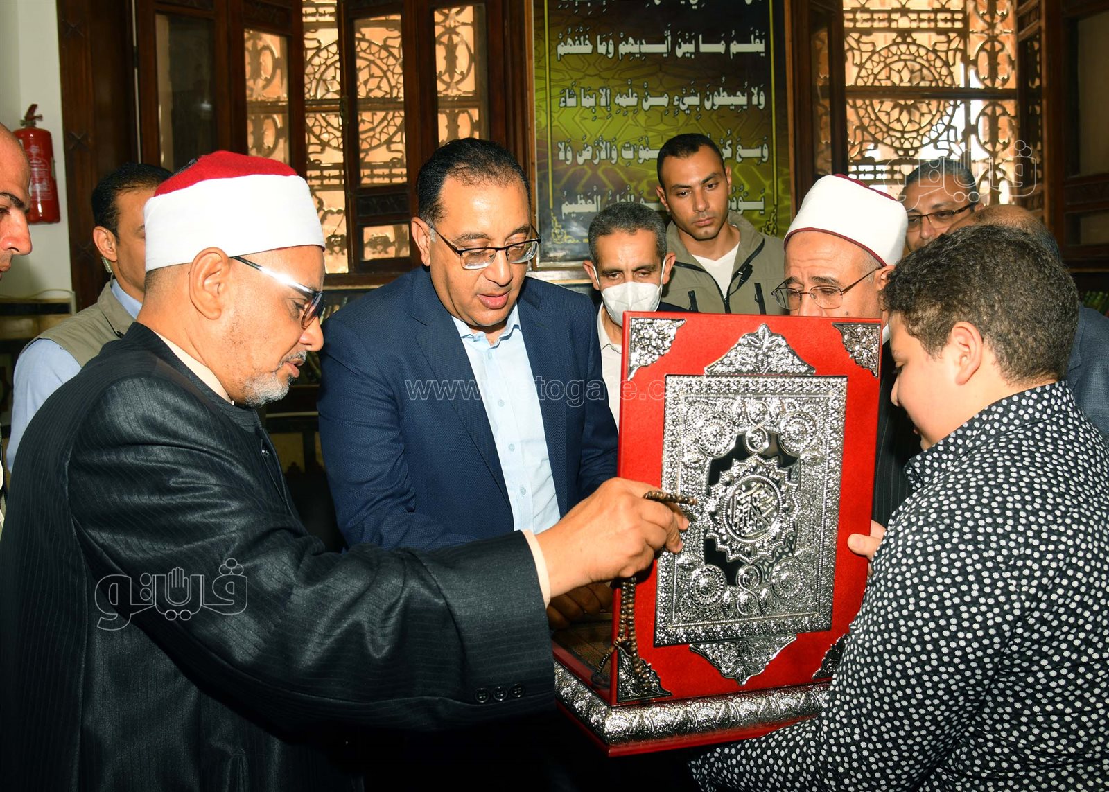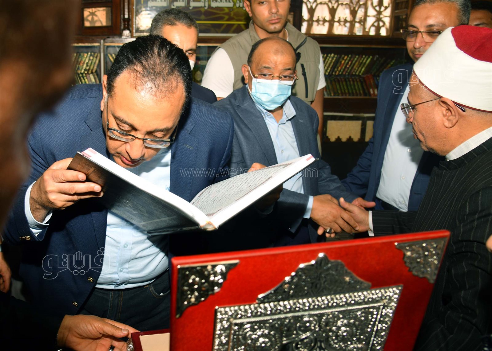 وعقب ذلك، دخل رئيس الوزراء ومرافقوه إلى المسجد بصحبة مسؤولي وزارة الأوقاف ومشيخة المسجد، الذين قدموا مصحفا شريفا هدية للدكتور مصطفى مدبولي للتعبير عن ترحيبهم بزيارة رئيس الوزراء ومرافقيه من الوزراء والمسؤولين.