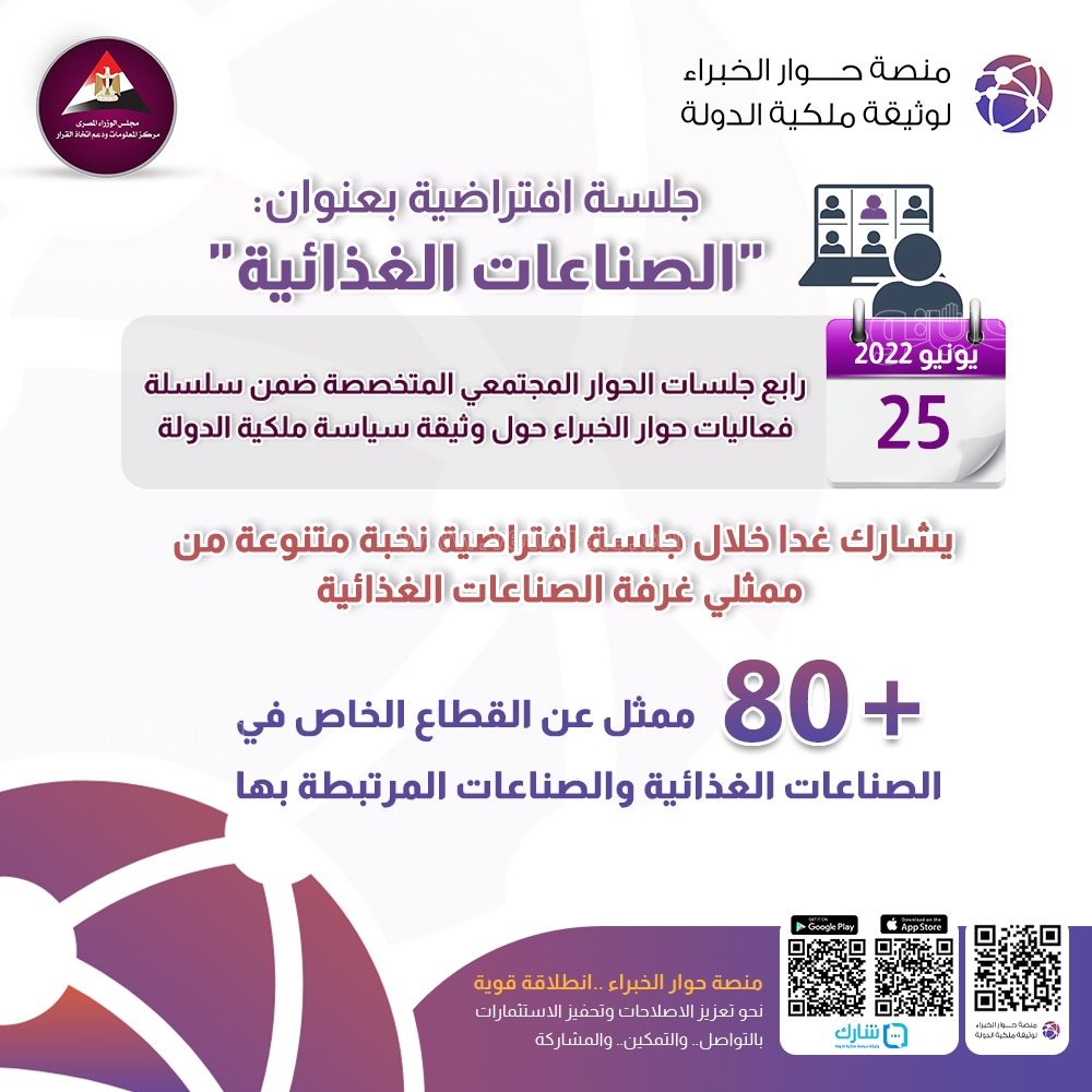 عقد مركز المعلومات ودعم اتخاذ القرار بمجلس الوزراء، لقاءً افتراضيًا، اليوم السبت، لمناقشة وثيقة "سياسة ملكية الدولة" بقطاع الصناعات الغذائية، بحضور أكثر من 80 مستثمرًا من أصحاب الشركات وممثلي الغرف الصناعية والمجالس التصديرية، في رابع ورش العمل ضمن "حوار الخبراء".