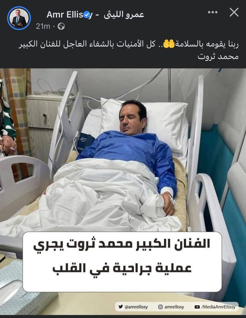 أعلن الفنان عمرو الليثي إجراء المطرب محمد ثروت لعملية جراحية بالقلب، وذلك عبر صفحته الرسمية بموقع التواصل الاجتماعي فيس بوك.