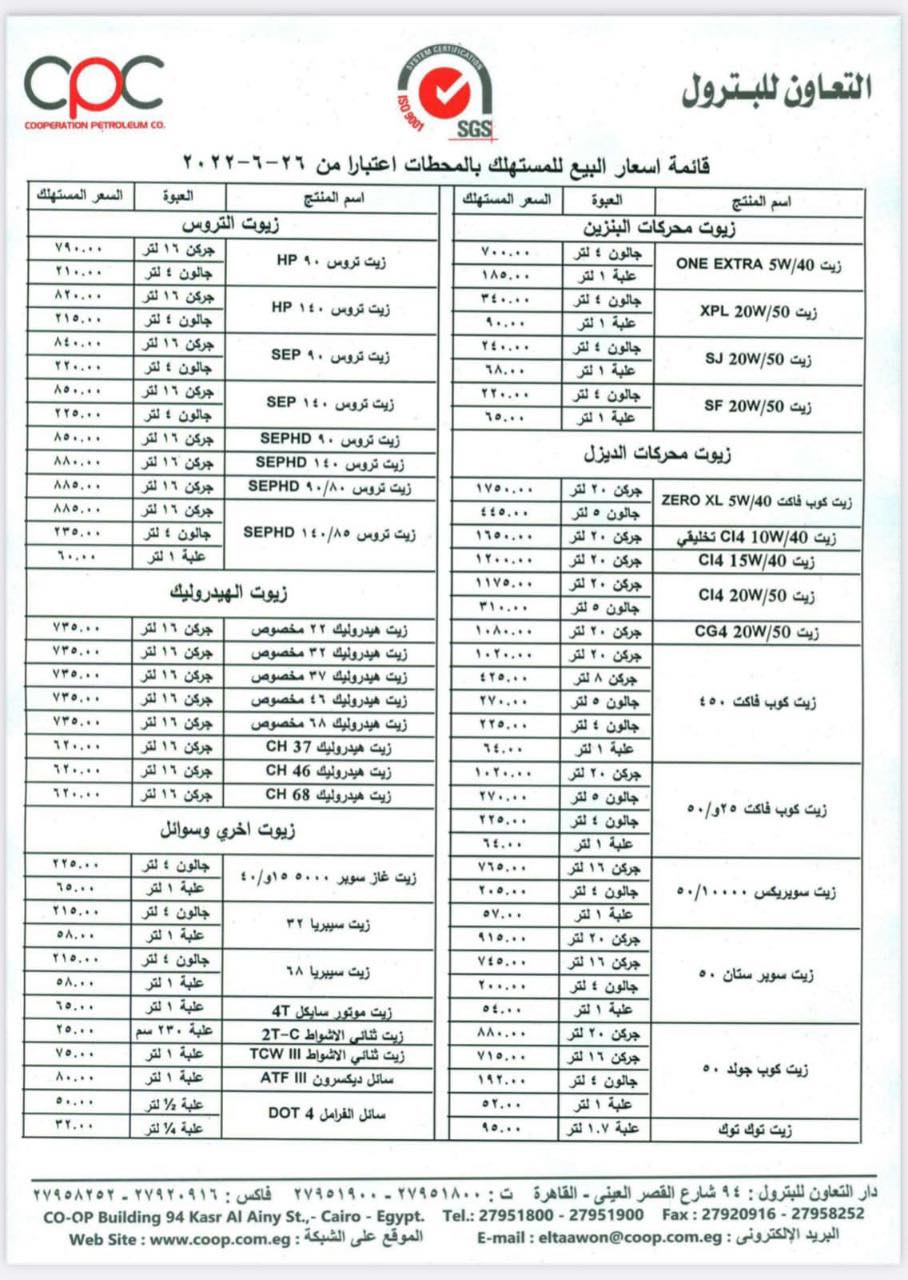 أعلنت شركة التعاون للبترول عن الأسعار الجديدة لزيوت السيارات اليوم والتي شملت زيادة عما كانت عليه خلال الفترة الماضية حيث سيتم تطبيق الأسعار الجديدة اعتبارا من اليوم.