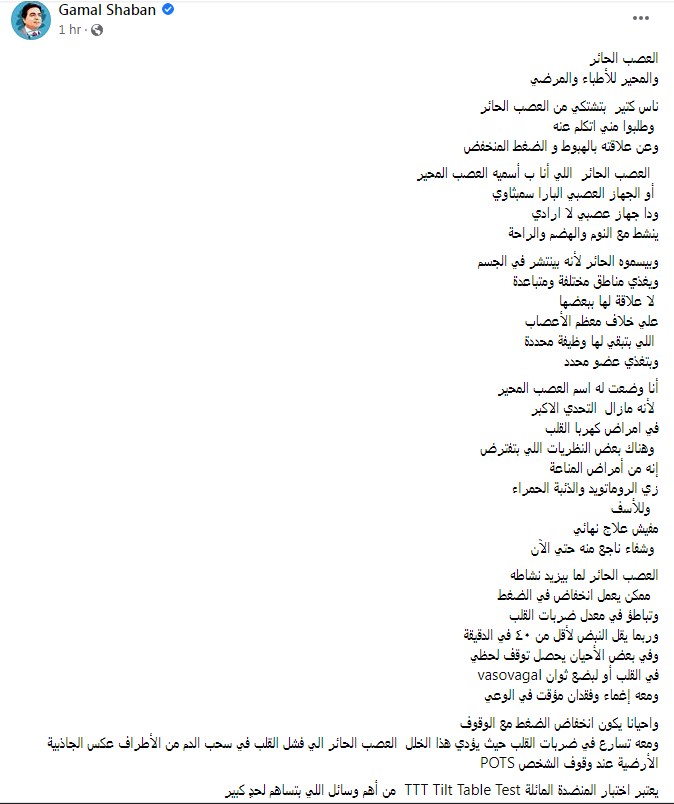 وكتب جمال شعبان تدوينة على الفيس بوك "العصب الحائر والمحير للأطباء والمرضي، ناس كتير بتشتكي من العصب الحائر وطلبوا مني اتكلم عنه، وعن علاقته بالهبوط والضغط المنخفض"