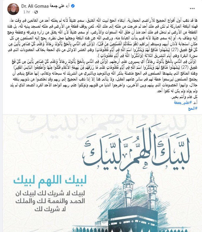 وكتب علي جمعة تدوينة على الفيس بوك "ها قد ذهب أول أفواج الحجيج للأراضي الحجازية، ابتغاء الحج لبيت الله العتيق، سمي عتيقًا لأنه لم يملكه أحد من العالمين في وقت ما، فهذه البقعة المباركة لم تكن في ملك أحد ثم خرجت من ملكه إلى ملك الله، كمن يوقف قطعة من الأرض في ملكه لمسجد يبنيه لله، بل هذه القطعة من الأرض لم تدخل في ملك أحد منذ أن خلق الله السموات والأرض"
