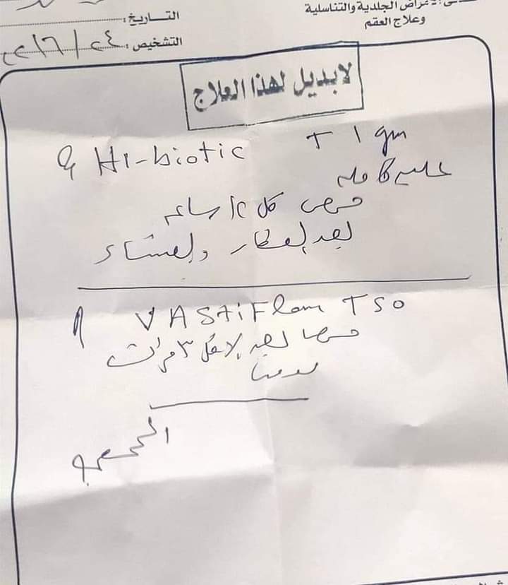 تداول نشطاء موقع التواصل الاجتماعي فيس بوك روشتة لطبيب تخصص أمراض جلدية وتناسلية تضم عددا من الأدوية ومكتوب على الروشتة " لا بديل لهذا العلاج".