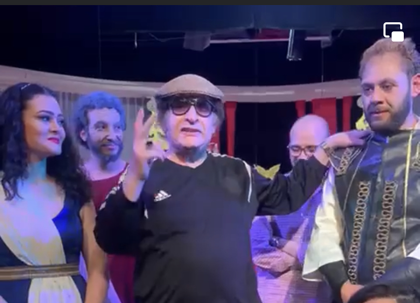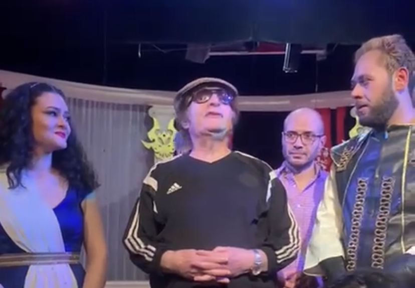 ليقوم محمد علي رزق بتقبيل رأس الفنان محيي إسماعيل، وسط تصفيق فريق المسرحية والجمهور المتواجد بعد تقديم العرض.