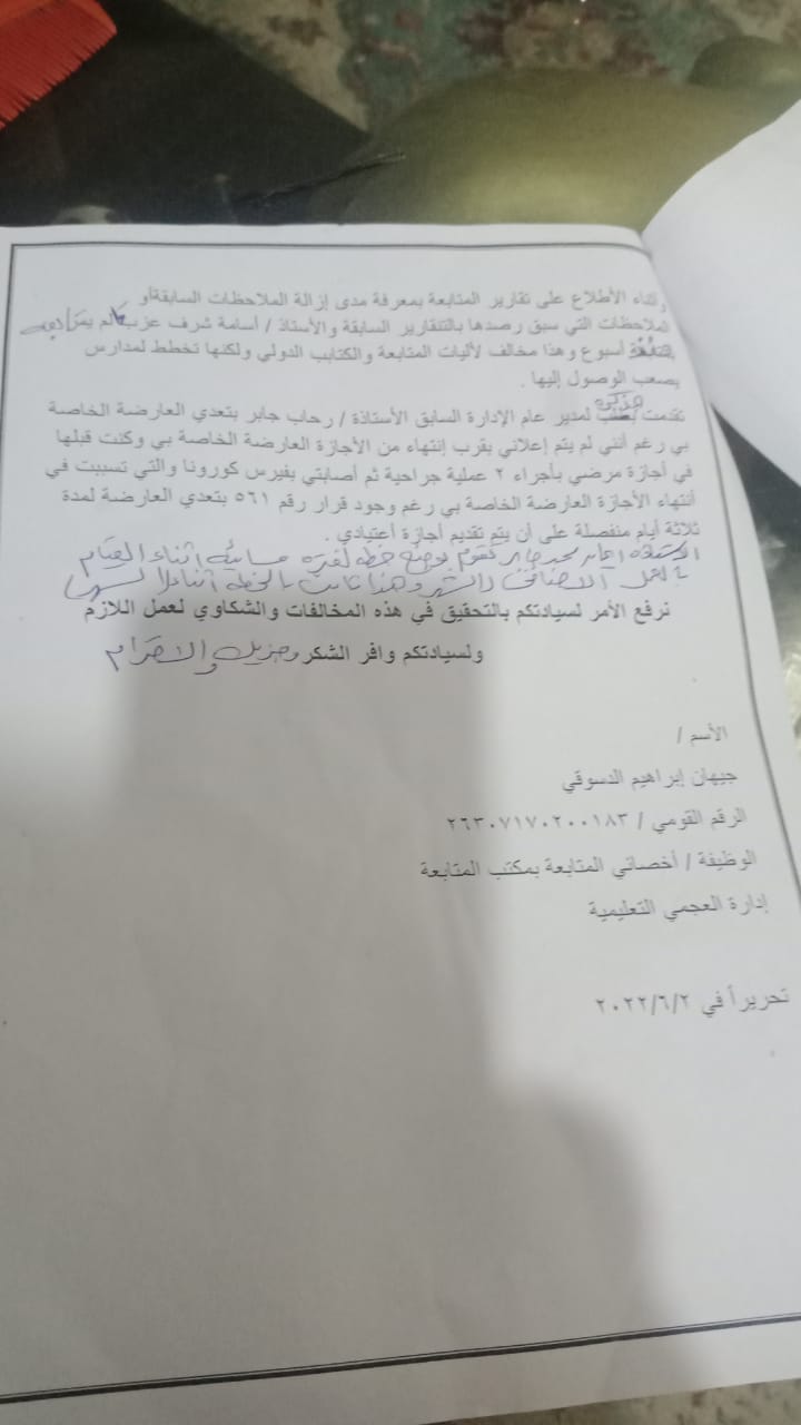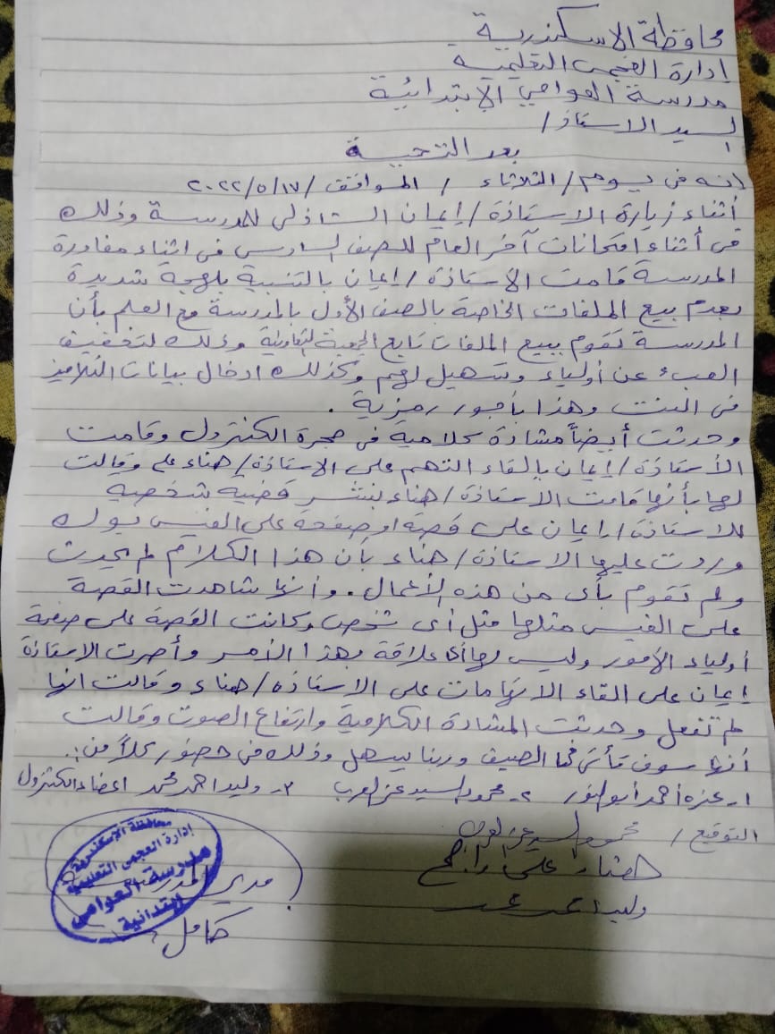 علي الجانب الآخر أكدت إدارة العجمي التعليمية، أن ازمه مدرسة طلائع العجمي المسائية والحاصله علي اعتماد الجودة وجري إلغائها يجري التحقيق فيها بواسطة النيابة الإدارية ولم تصل نتائج التحقيقات حتي الآن، وننتظر التعليمات في كيفية التعامل مع إدارة الجودة في هذا الأمر عند التجديد وكذلك الأمور الورقية والاختام الخاصة بالمدرسة، لافته ان الشكاوي الآخر الخاصة بإدارة المتابعه تتابعه المديرية ويجري تحويلها الي الإدارة المركزية للمتابعه في الوزارة طبقا لنص الكتاب الدوري رقم ٤ والماده العاشرة به.