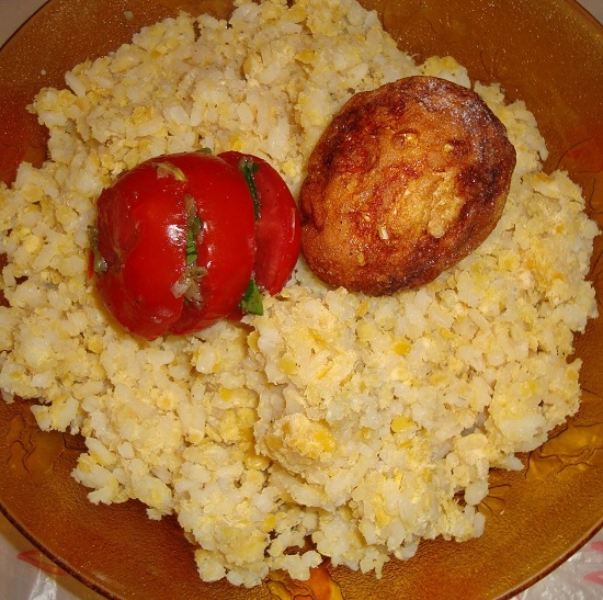 - يقدم الأرز مع صوص الطماطم ويزين بالبيض والبصل.
