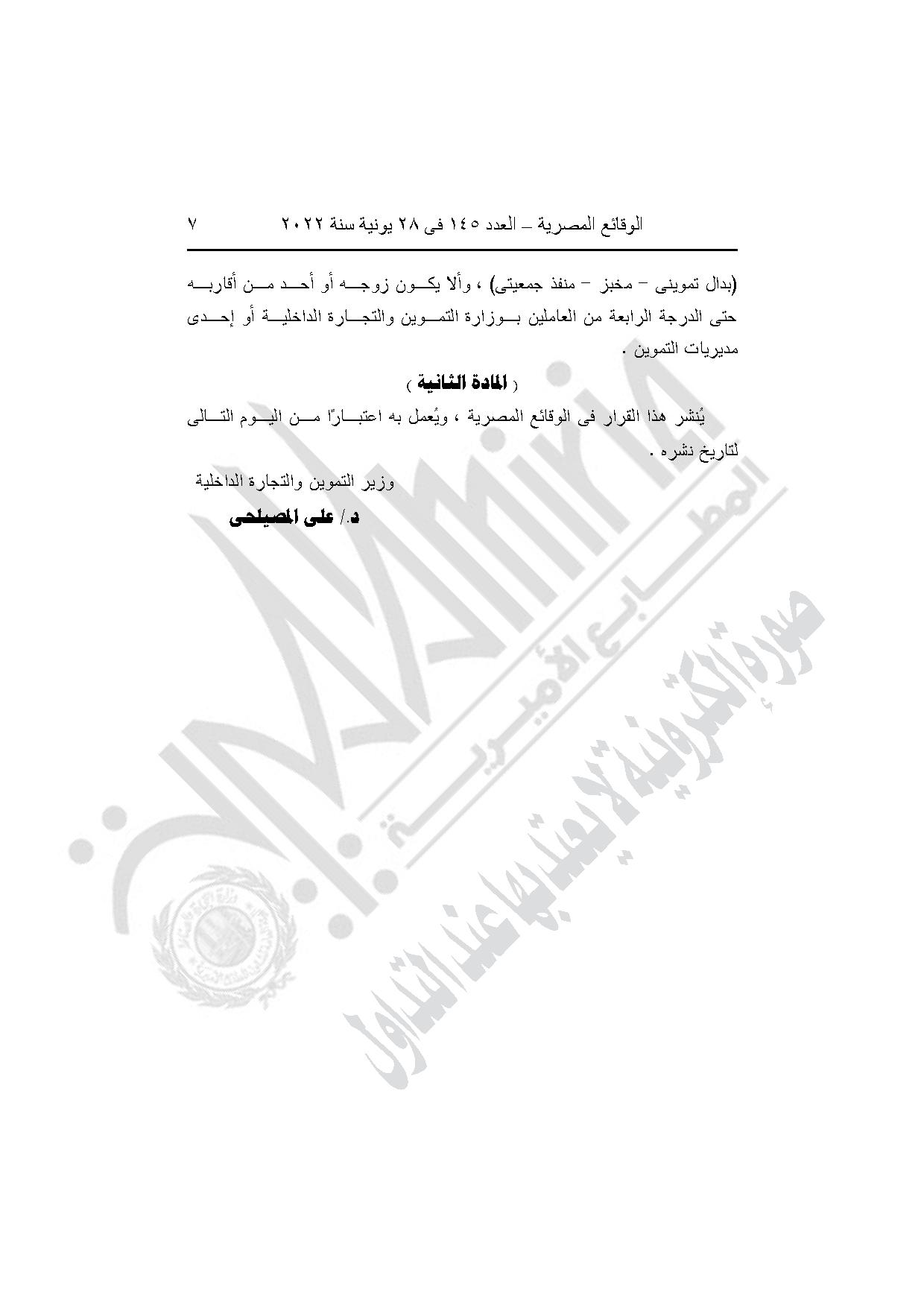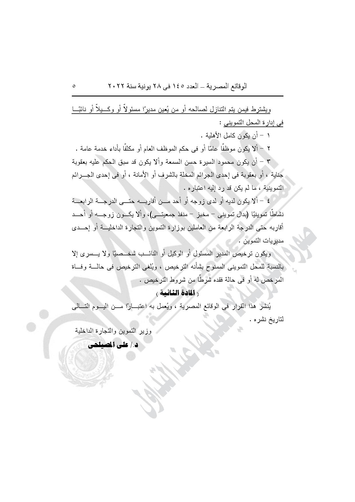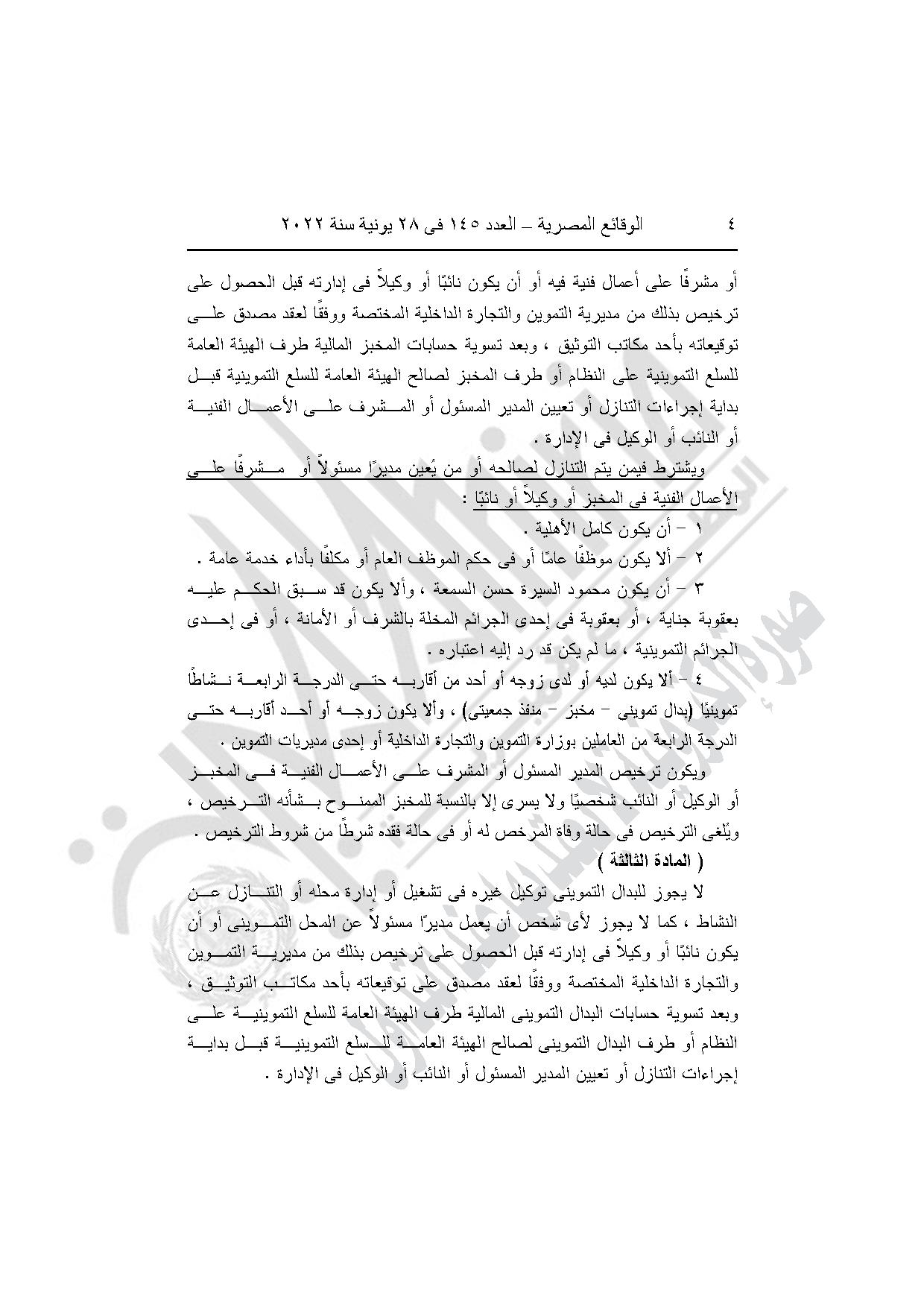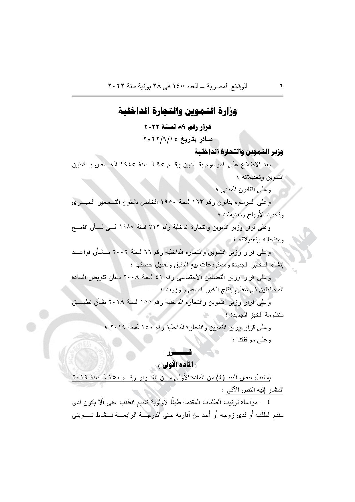 والقرار رقم 89 لسنة 2022، بشأن الاستبدال بنص البند 4 من المادة الأولى من القرار رقم 150 لسنة 2019 بمراعاة ترتيب الطلبات المقدمة طبقًا لأولوية تقديم الطلب على ألا يكون لدى مقدم الطلب أو لدى زوجته أو أحد أقاربه حتى الدرجة الرابعة نشاط تمويني (بدال تمويني- مخبز- منفذ جمعيتي)، وألا يكون زوجه أو أحد من أقاربه حتى الدرجة الرابعة من العاملين بوزارة التموين والتجارة الداخلية أو إحدى مديريات التموين.