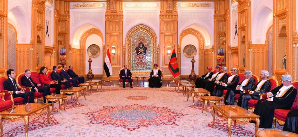 وصرح السفير بسام راضي المتحدث الرسمي باسم رئاسة الجمهورية بأن الرئيس وجلالة السلطان هيثم بن طارق عقدا جلسة مباحثات موسعة ضمت وفدي البلدين، حيث رحب السلطان هيثم بن طارق بالرئيس في سلطنة عمان، مشيدًا بالروابط الأخوية الوثيقة والتاريخية التي تجمع بين البلدين، ومعربًا عن تقديره للجهود المصرية الداعمة للشأن العماني على كافة الأصعدة، فضلًا عن إسهام الجالية المصرية في عملية البناء والتنمية بعمان في مختلف المجالات، مع التأكيد على حرص عمان على تعزيز أطر التعاون الثنائي الراسخة مع مصر فى مختلف المجالات خلال الفترة المقبلة، بما فيها من خلال زيادة الاستثمارات العمانية في مصر واستغلال الفرص الاستثمارية المتاحة بها.