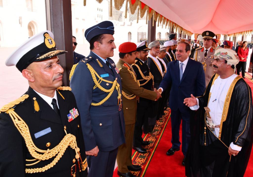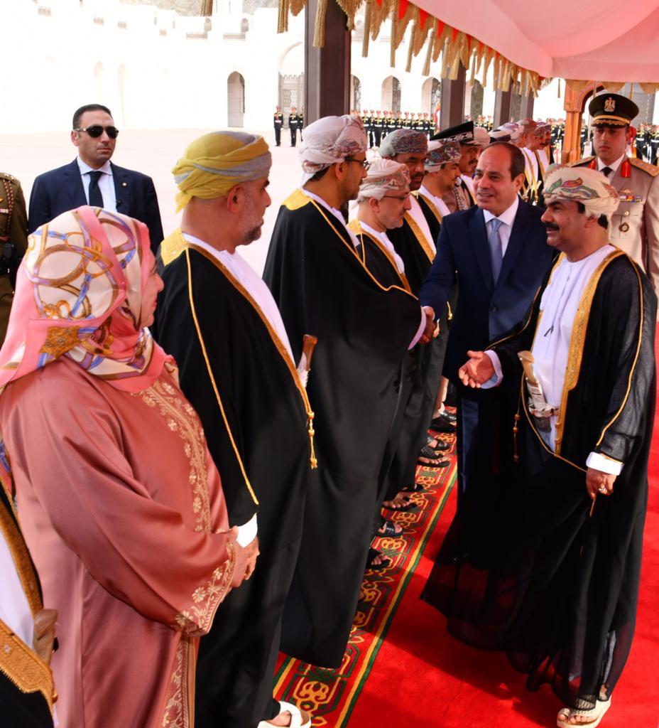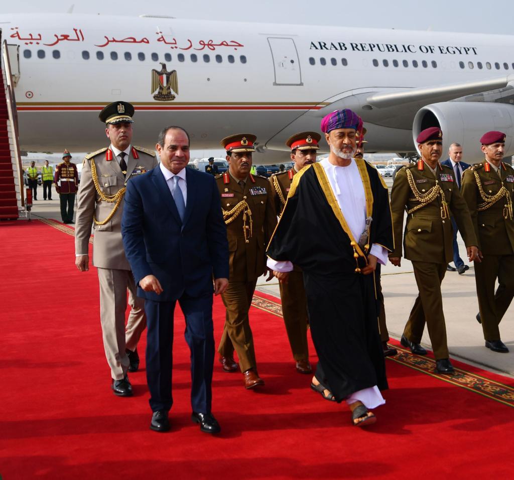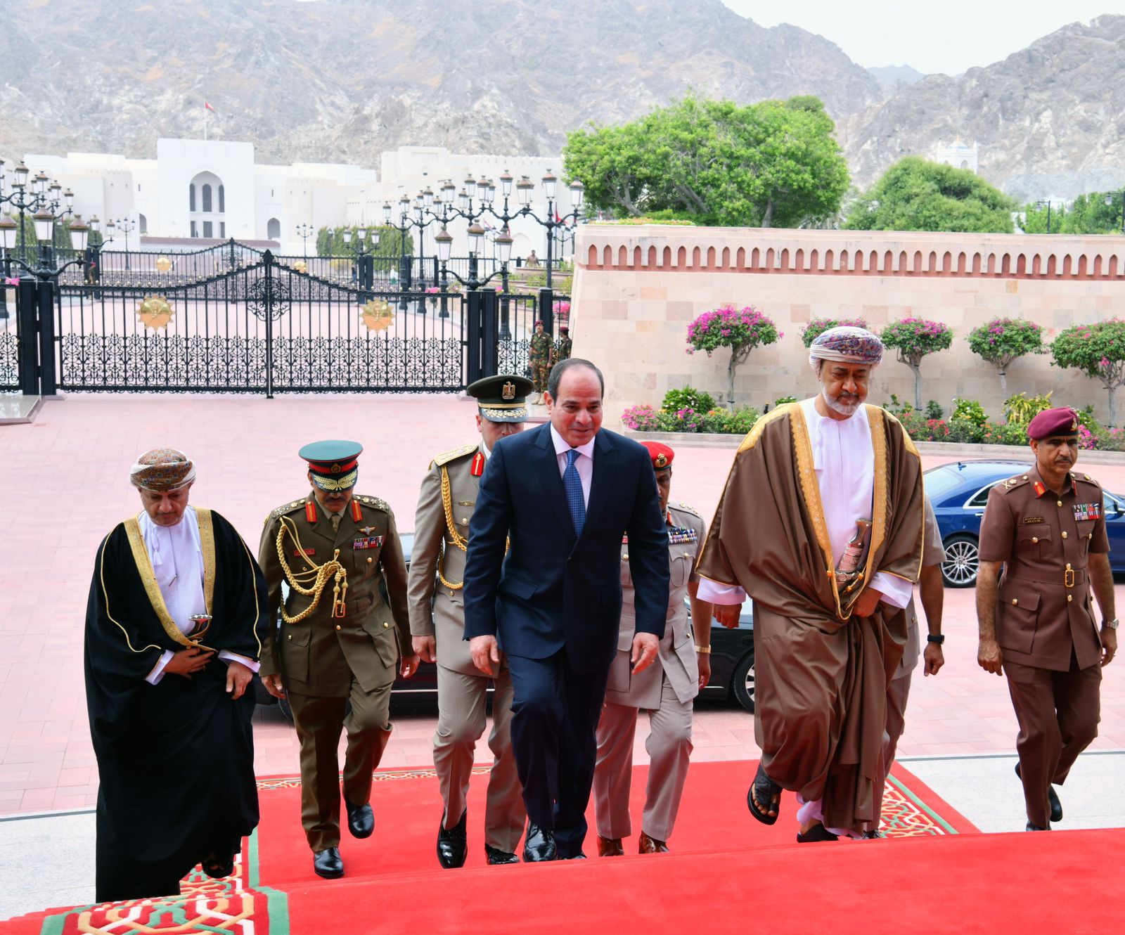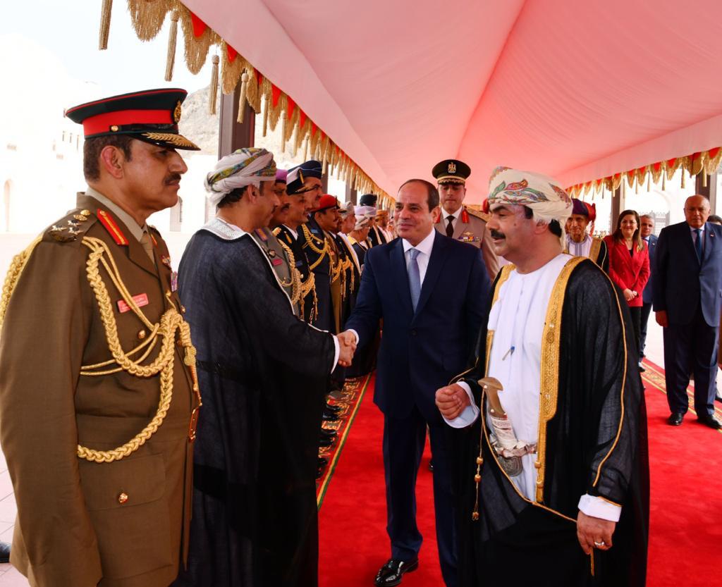 التقى الرئيس عبد الفتاح السيسي في اليوم الأول في قصر العلم العامر بالعاصمة العمانية مسقط، مع جلالة السلطان هيثم بن طارق آل سعيد، سلطان عمان، حيث أقيمت للرئيس مراسم الاستقبال الرسمي، وتم عزف السلامين الوطنيين واصطفاف حرس الشرف."