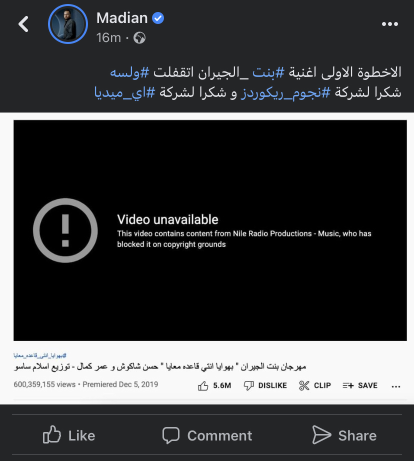 كشف الملحن مدين عبر حسابه الشخصي على موقع التواصل الاجتماعي "فيس بوك" عن إزالة موقع الفيديوهات الشهير "يوتيوب" لمهرجان بنت الجيران، وذلك عقب اتخاذ إجراءات ضدها من الشركة المنتجة لأغنية "حاجة مستخبية" للنجم محمد حماقي.