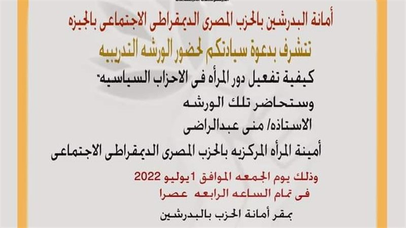 يعقد الحزب المصري الديمقراطي برئاسة المهندس فريد زهران، ورشة عمل تدريبية بأمانة الحزب بالبدرشين في الرابعة عصر الجمعة الموافق 1 يوليو 2022 بمقر الحزب، خلف مركز البدرشين تحت عنوان: كيفية تفعيل دور المرأة في الأحزاب السياسية.