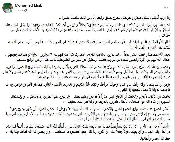 الحمد لله اليوم أترك السباق كلاعبًا، وبكامل إرادتى ليس ضعفًا ولا تخاذلًا، ولكن من أجل ثقتكم الغالية فى وعودى والميثاق المبنى على الصدق والإطار الذى عودتكم أن ترونى فيه واحترامًا لنفسى انسحب بعد إلغاء فئة وزنى (81 كجم) من الأولمبياد القادمة باريس 2024.