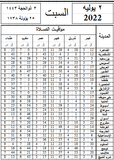 مواقيت الصلاة اليوم وفقًا للتوقيت المحلي لمدينتي القاهرة والإسكندرية وعدد من مدن ومحافظات الجمهورية: