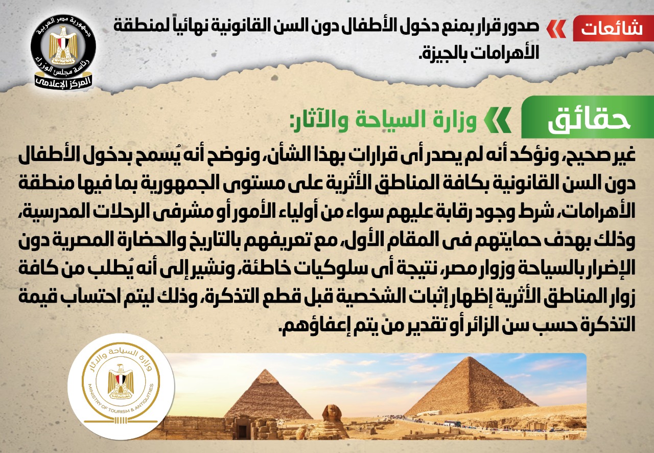 رصد المركز الإعلامي بمجلس الوزراء تداول أنباء بشأن صدور قرار بمنع دخول الأطفال دون السن القانونية نهائيًا لمنطقة الأهرامات بالجيزة، وقد قام المركز الإعلامي لمجلس الوزراء بالتواصل مع وزارة السياحة والآثار، والتي نفت تلك الأنباء.