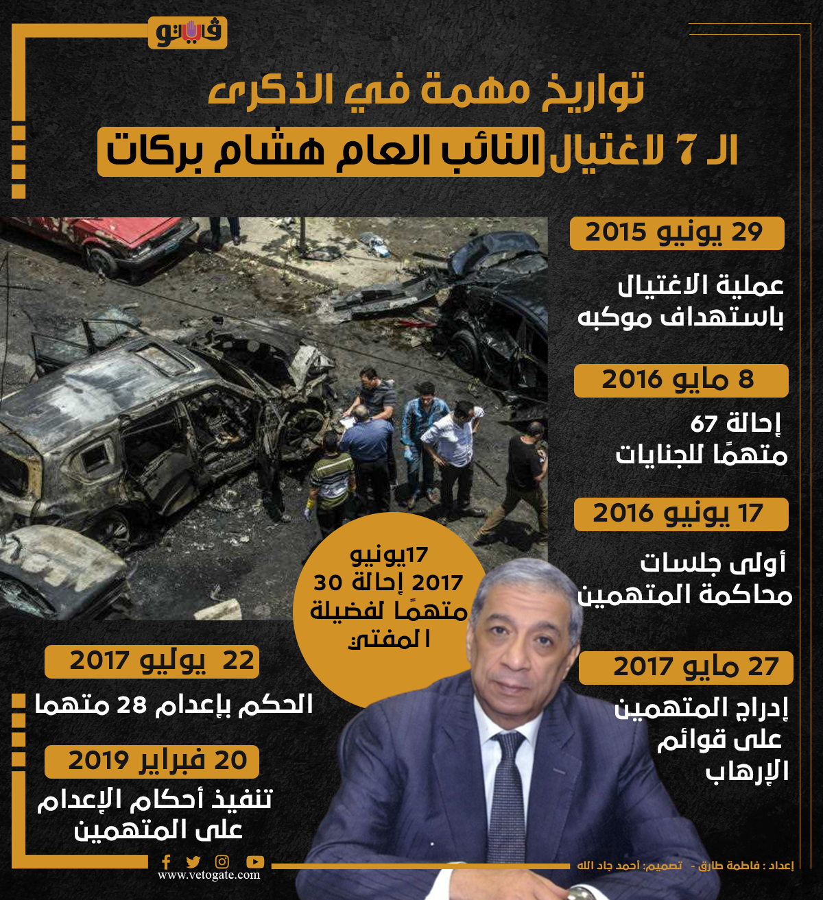 تواريخ مهمة في الذكرى الـ 7 لاغتيال النائب العام هشام بركات | انفوجراف الأربعاء 29/يونيو/2022 - 01:30 م 6/29/2022 1:30:42 PM هشام بركات فاطمة طارق شارك طباعة 18 حجم الخط شارك طباعة النائب العام هشام بركات إرهابيين المستشار قوائم الارهاب النائب العام هشام بركات احكام الإعدام