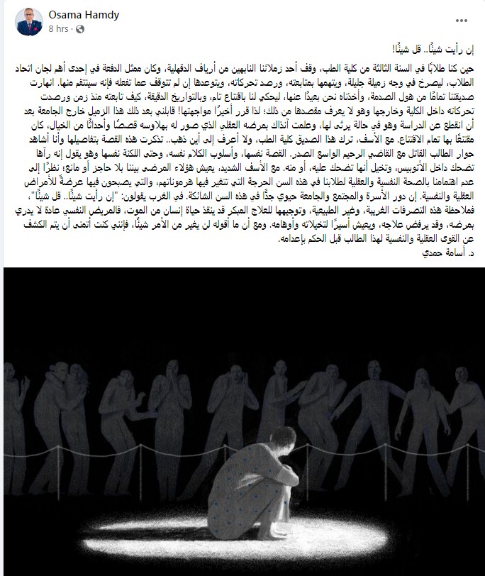 وكتب دكتور أسامة حمدي تدوينة على الفيس بوك "إن رأيت شيئًا.. قل شيئًا! حين كنا طلابًا في السنة الثالثة من كلية الطب، وقف أحد زملائنا النابهين من أرياف الدقهلية، وكان ممثل الدفعة في إحدى أهم لجان اتحاد الطلاب، ليصرخ في وجه زميلة جليلة، ويتهمها بمتابعته، ورصد تحركاته، ويتوعدها إن لم تتوقف عما تفعله فإنه سينتقم منها".