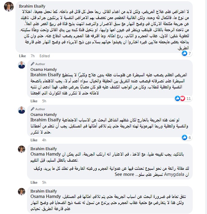 وعن المريض العقلي قال د. أسامة: "المريض العقلي يصعب عليه السيطرة عن هلوسات عقله بدون علاج وكثيرًا لا يستطيع السيطرة على تصرفاته فيصعب عنده التفريق بين الحقيقة والخيال. سواء أعدم أم لا، يجب الاهتمام بالصحة النفسية والعقلية للطلاب. وكان من الواجب الكشف عليه فلو كان مصابًا بمرض عقلي، فهذا ادعى ان نتنبه لامثاله حتى لا تتكرر هذه الكوارث التي افجعتنا"
