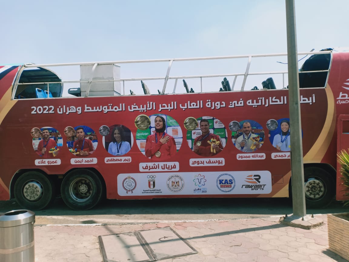 أتوبيس مكشوف لاستقبال بعثة الكاراتيه المشاركة ببطولة البحر المتوسط بمطار القاهرة
