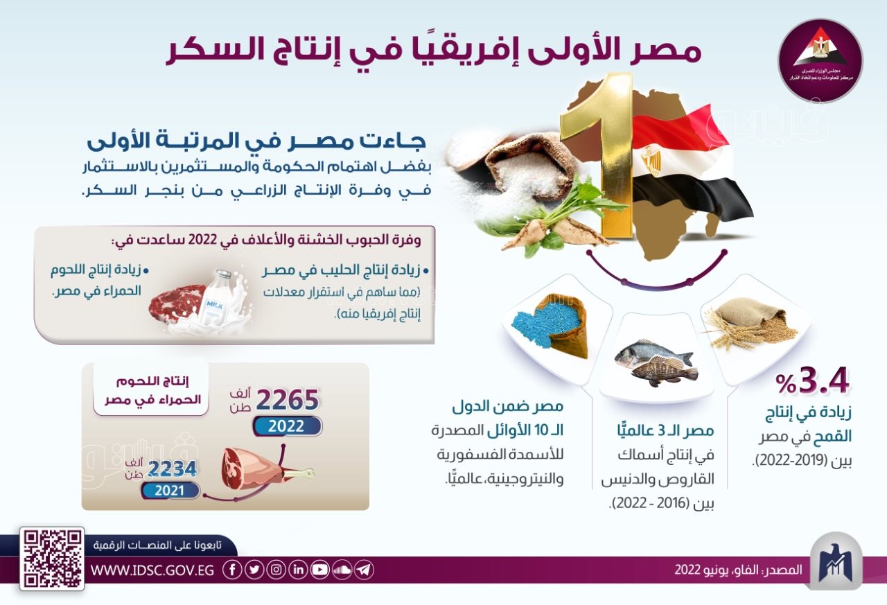 نشر مركز المعلومات ودعم اتخاذ القرار إنفوجرافيك جديد بعنوان “مصر الأولى أفريقيًّا في إنتاج السكر” يبرز فيه أبرز ما جاء في تقرير الفاو النصف سنوي عن توقعات الغذاء العالمية، والتي برز فيها دور مصر كمصدر ومنتج مهم لعدد من السلع.