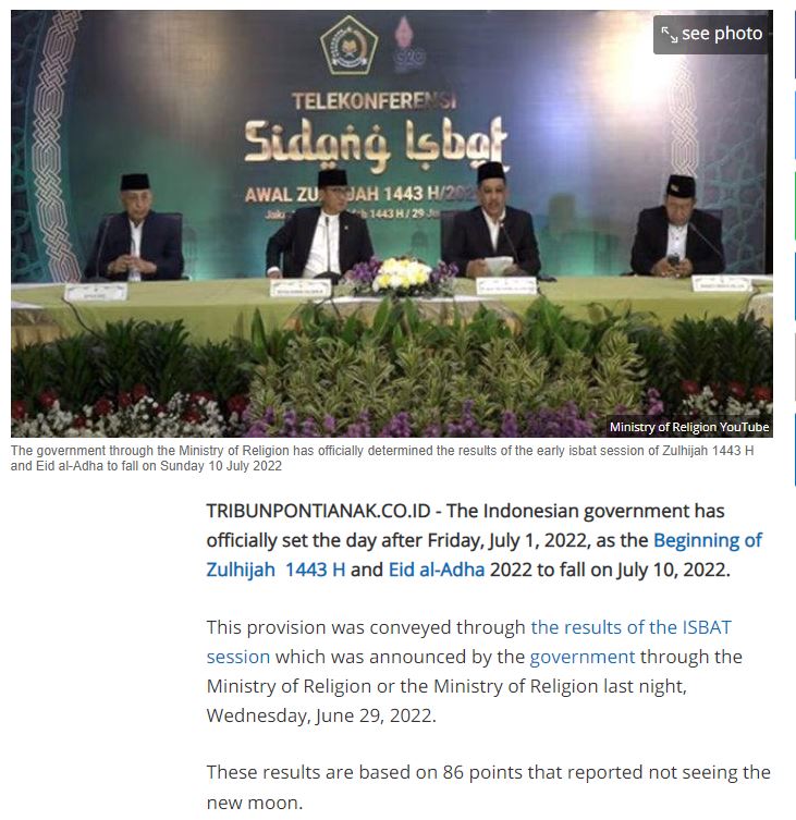 أعلنت إندونيسيا مساء اليوم الأربعاء رسميا عدم ثبوت رؤية الهلال اليوم، وأن الجمعة 01 يوليو أول أيام شهر ذي الحجة، والأحد 10 يوليو أول أيام عيد الأضحى المبارك فيها، وذلك بعد تحري الهلال من 86 موقع.