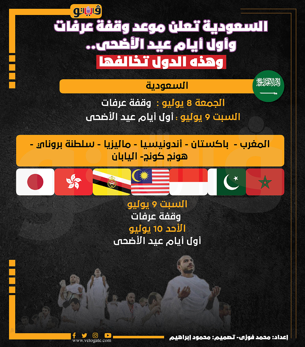 السعودية تعلن موعد وقفة عرفات وأول أيام عيد الأضحى.. وهذه الدول تخالفها | إنفوجراف الخميس 30/يونيو/2022 - 11:34 ص 6/30/2022 11:34:41 AM وقفة عرفات محمد فوزى شارك طباعة 18 حجم الخط شارك طباعة عيد الأضحى السعودية مصر سلطنة عمان باكستان أندونيسيا